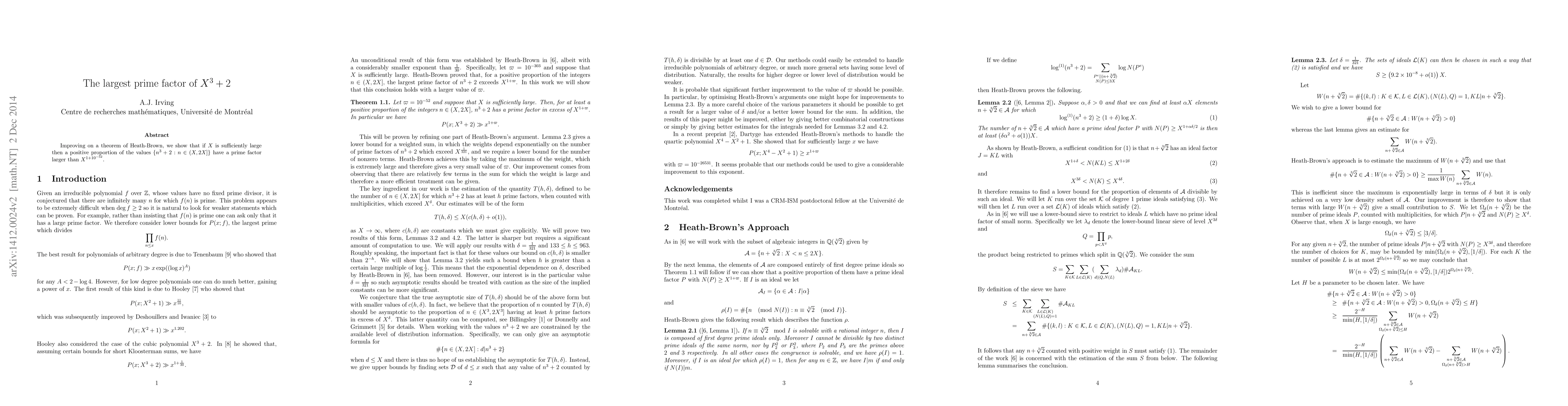 Improving on a theorem of Heath-Brown, we show that if $X$ is sufficiently large then a positive proportion of the values $\{n^3+2:n\in (X,2X]\}$ have a prime factor larger than $X^{1+10^{-52}}$.