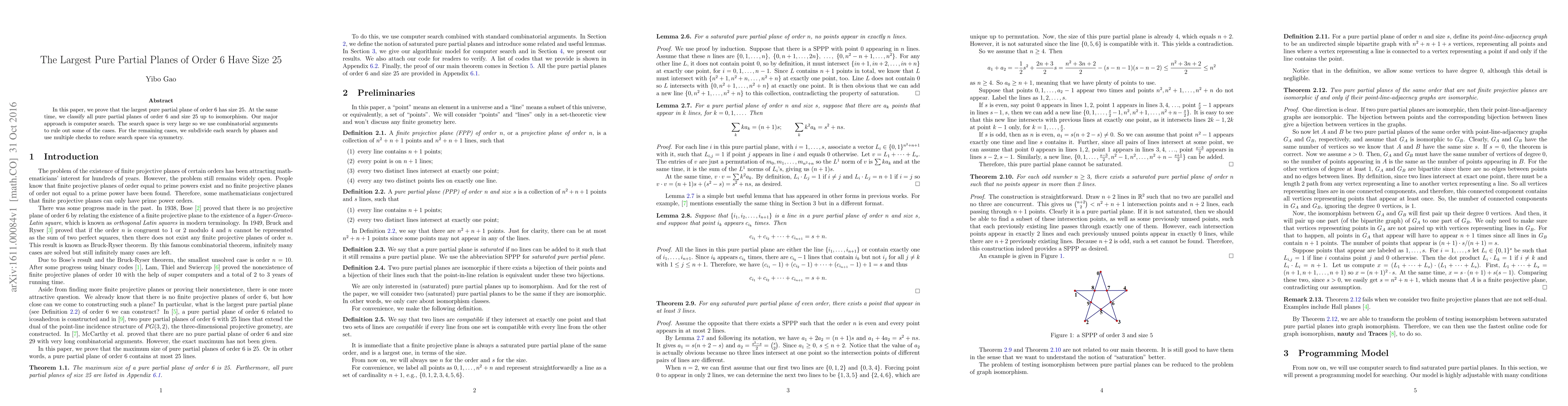 In this paper, we prove that the largest pure partial plane of order 6 has size 25. At the same time, we classify all pure partial planes of order 6 and size 25 up to isomorphism. Our major approach is computer search. The search space is very large so we use combinatorial arguments to rule out some of the cases. For the remaining cases, we subdivide each search by phases and use multiple checks to reduce search space via symmetry.