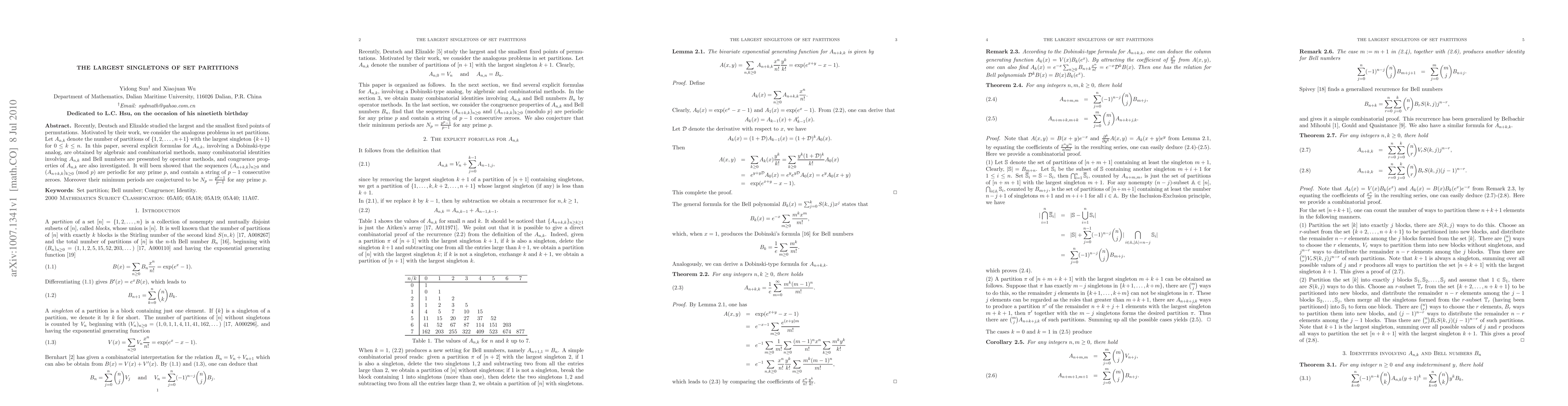 This paper investigates the number of set partitions with the largest singleton $\{k+1\}$, denoted as $A_{n,k}$. It derives explicit formulas for $A_{n,k}$ using algebraic and combinatorial methods, and explores their congruence properties, revealing periodic behavior modulo primes with a conjectured minimum period.