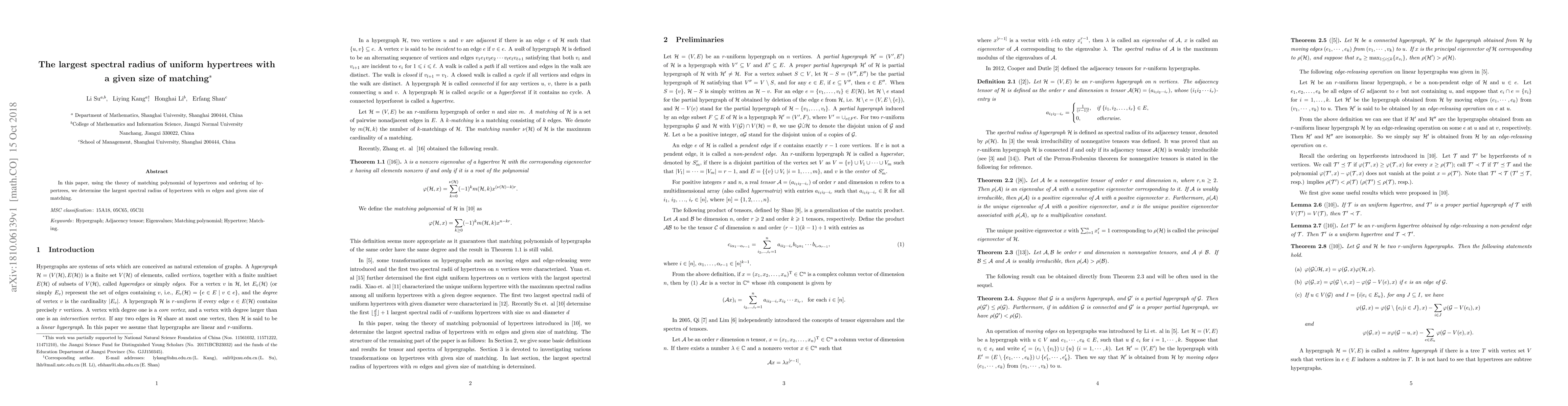 Summary: This paper determines the largest spectral radius of uniform hypertrees with a specific number of edges and a fixed matching size using matching polynomial theory and hypertree ordering. The findings provide insights into the structural properties of hypertrees.