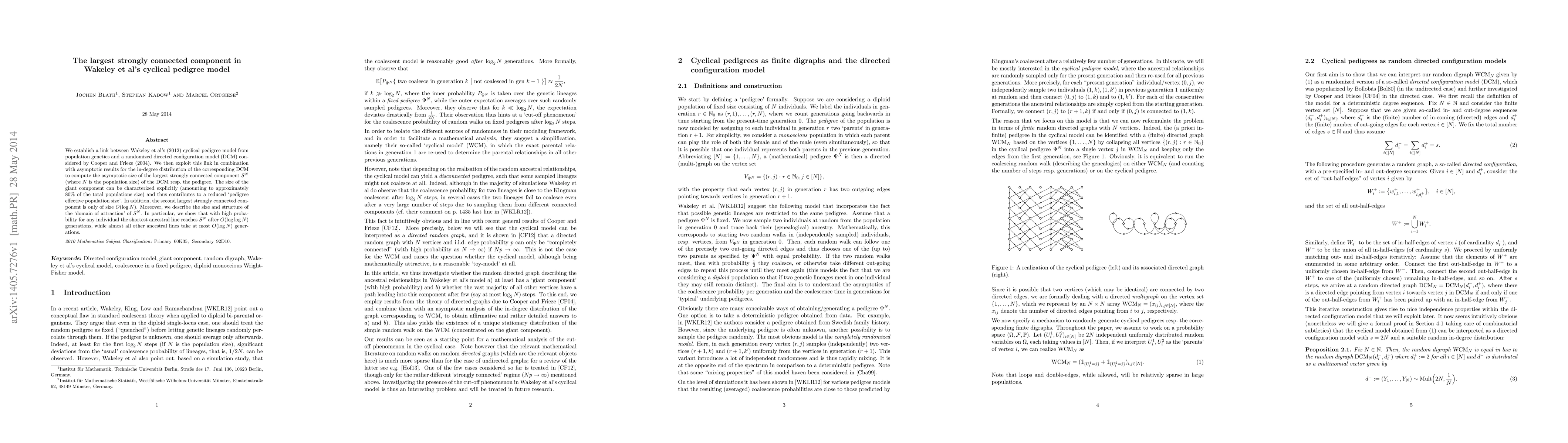 This research connects Wakeley et al's cyclical pedigree model in population genetics with a randomized directed configuration model. It calculates the asymptotic size of the largest strongly connected component, approximately 80% of the population, and shows the second largest is O(log N). It also reveals that ancestral lines reach this giant component within O(log log N) generations for most individuals.