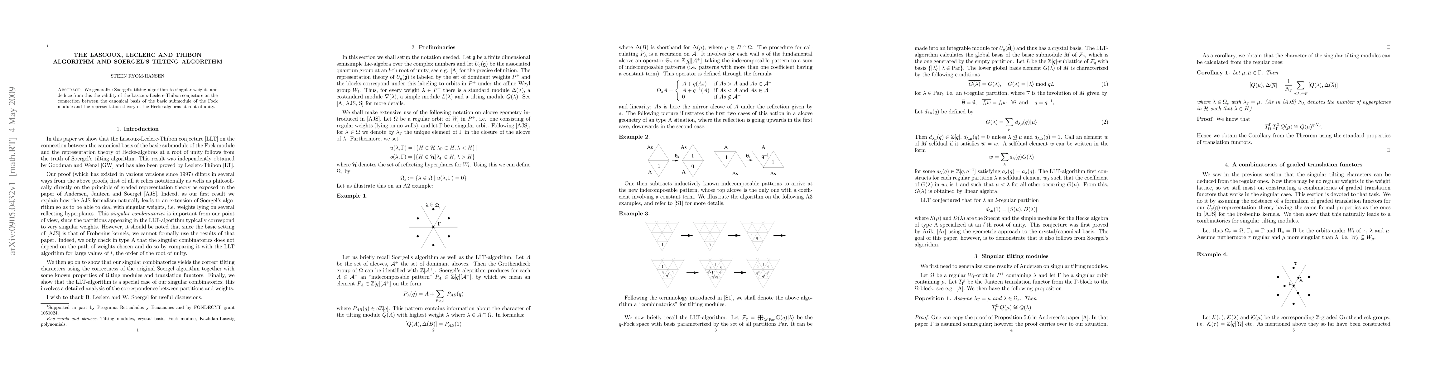 This paper generalizes Soergel's tilting algorithm to accommodate singular weights, thereby confirming the Lascoux-Leclerc-Thibon conjecture linking the canonical basis of the Fock module's basic submodule to the representation theory of Hecke algebras at root of unity.