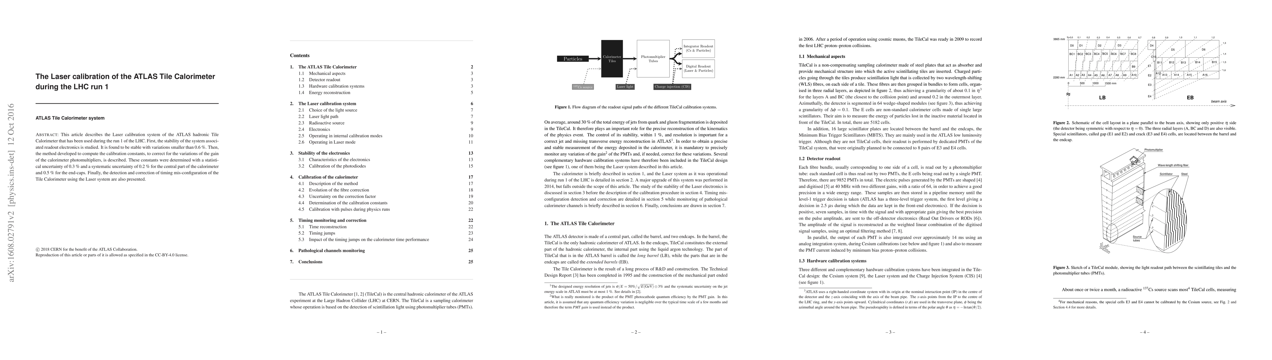 This paper details the Laser calibration system used for the Atlas Tile Calorimeter during LHC run 1, demonstrating stability of the readout electronics and presenting calibration constants with uncertainties of 0.3% statistically and 0.2-0.5% systematically. It also outlines the method for detecting and correcting timing mis-configurations via the Laser system.