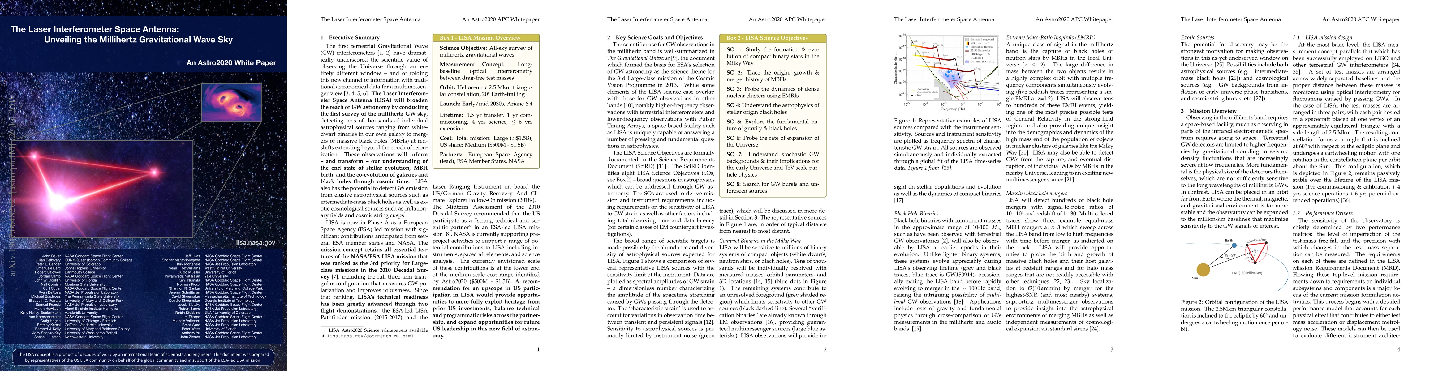 The first terrestrial gravitational wave interferometers have dramatically underscored the scientific value of observing the Universe through an entirely different window, and of folding this new channel of information with traditional astronomical data for a multimessenger view. The Laser Interferometer Space Antenna (LISA) will broaden the reach of gravitational wave astronomy by conducting the first survey of the millihertz gravitational wave sky, detecting tens of thousands of individual astrophysical sources ranging from white-dwarf binaries in our own galaxy to mergers of massive black holes at redshifts extending beyond the epoch of reionization. These observations will inform - and transform - our understanding of the end state of stellar evolution, massive black hole birth, and the co-evolution of galaxies and black holes through cosmic time. LISA also has the potential to detect gravitational wave emission from elusive astrophysical sources such as intermediate-mass black holes as well as exotic cosmological sources such as inflationary fields and cosmic string cusps.