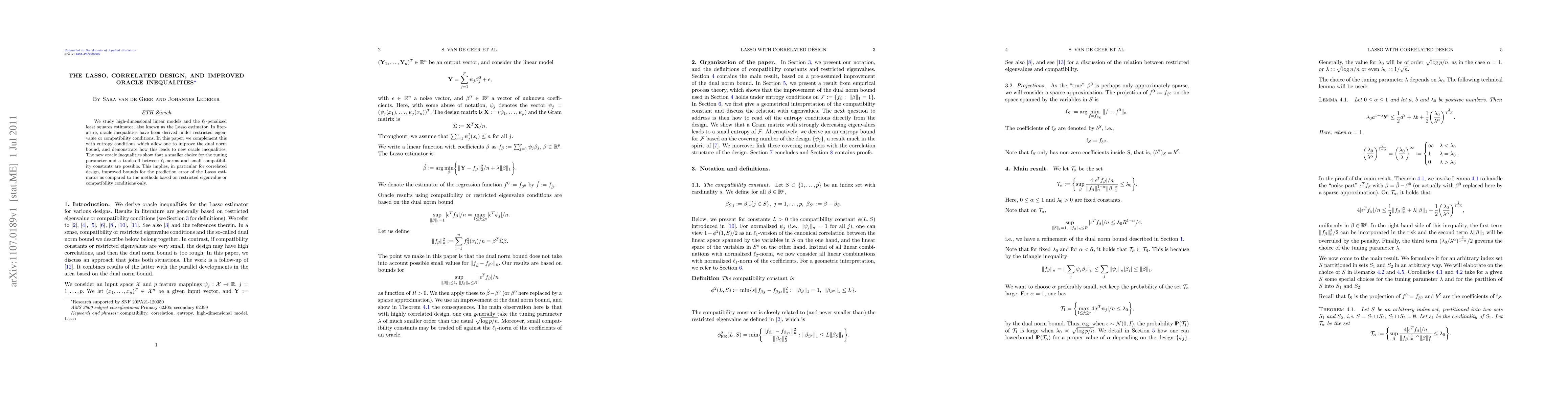 This paper investigates the $\ell_1$-penalized least squares estimator (Lasso) in high-dimensional linear models, introducing entropy conditions to improve dual norm bounds and derive new oracle inequalities. These inequalities allow for a smaller tuning parameter and better trade-offs, resulting in enhanced prediction error bounds for correlated designs.