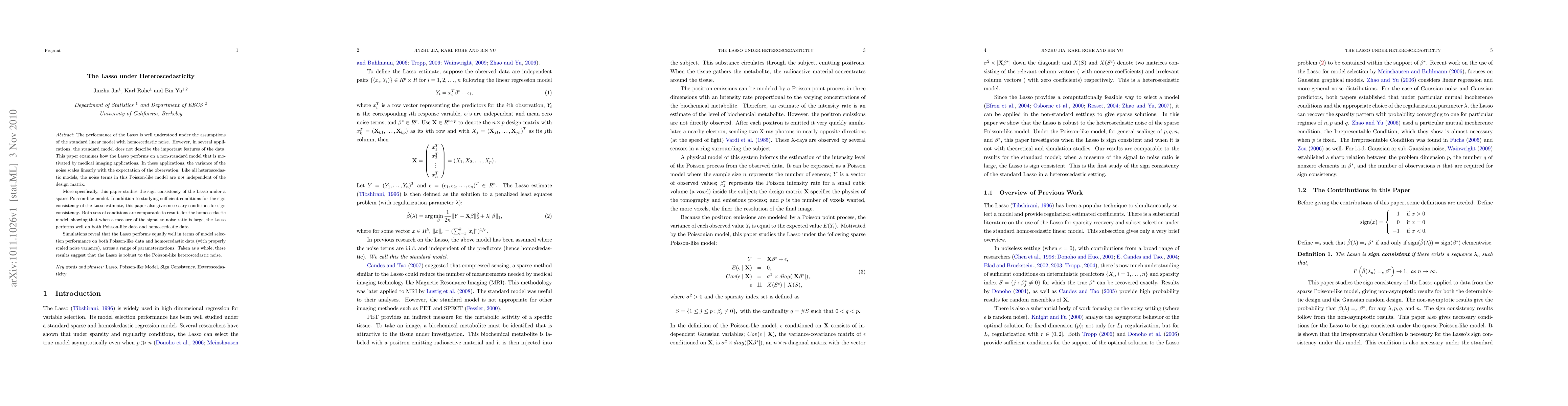 This paper investigates the performance of the Lasso under heteroscedasticity, specifically in a sparse Poisson-like model common in medical imaging. It finds that the Lasso maintains sign consistency and model selection performance comparable to homoscedastic scenarios when the signal-to-noise ratio is sufficiently large.