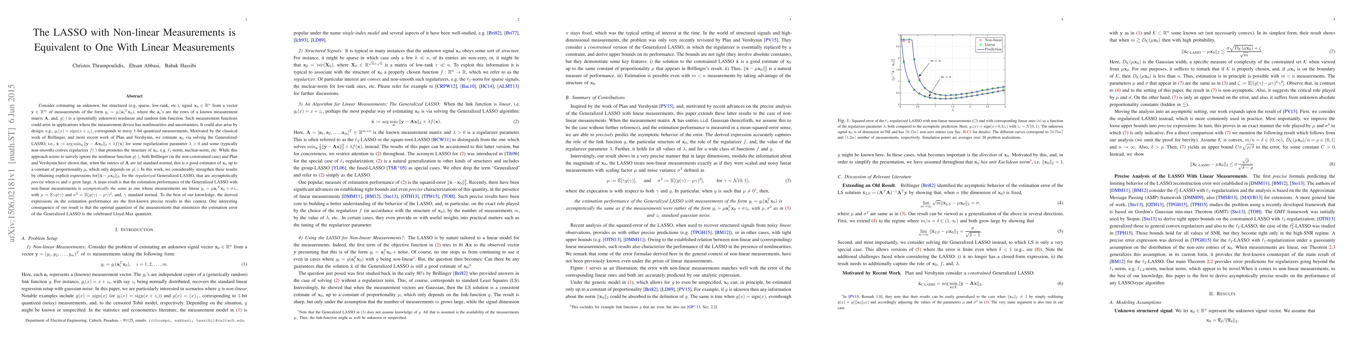 Consider estimating an unknown, but structured, signal $x_0\in R^n$ from $m$ measurement $y_i=g_i(a_i^Tx_0)$, where the $a_i$'s are the rows of a known measurement matrix $A$, and, $g$ is a (potentially unknown) nonlinear and random link-function. Such measurement functions could arise in applications where the measurement device has nonlinearities and uncertainties. It could also arise by design, e.g., $g_i(x)=\text{sign}(x+z_i)$, corresponds to noisy 1-bit quantized measurements. Motivated by the classical work of Brillinger, and more recent work of Plan and Vershynin, we estimate $x_0$ via solving the Generalized-LASSO for some regularization parameter $\lambda>0$ and some (typically non-smooth) convex structure-inducing regularizer function. While this approach seems to naively ignore the nonlinear function $g$, both Brillinger (in the non-constrained case) and Plan and Vershynin have shown that, when the entries of $A$ are iid standard normal, this is a good estimator of $x_0$ up to a constant of proportionality $\mu$, which only depends on $g$. In this work, we considerably strengthen these results by obtaining explicit expressions for the squared error, for the \emph{regularized} LASSO, that are asymptotically \emph{precise} when $m$ and $n$ grow large. A main result is that the estimation performance of the Generalized LASSO with non-linear measurements is \emph{asymptotically the same} as one whose measurements are linear $y_i=\mu a_i^Tx_0 + \sigma z_i$, with $\mu = E\gamma g(\gamma)$ and $\sigma^2 = E(g(\gamma)-\mu\gamma)^2$, and, $\gamma$ standard normal. To the best of our knowledge, the derived expressions on the estimation performance are the first-known precise results in this context. One interesting consequence of our result is that the optimal quantizer of the measurements that minimizes the estimation error of the LASSO is the celebrated Lloyd-Max quantizer.