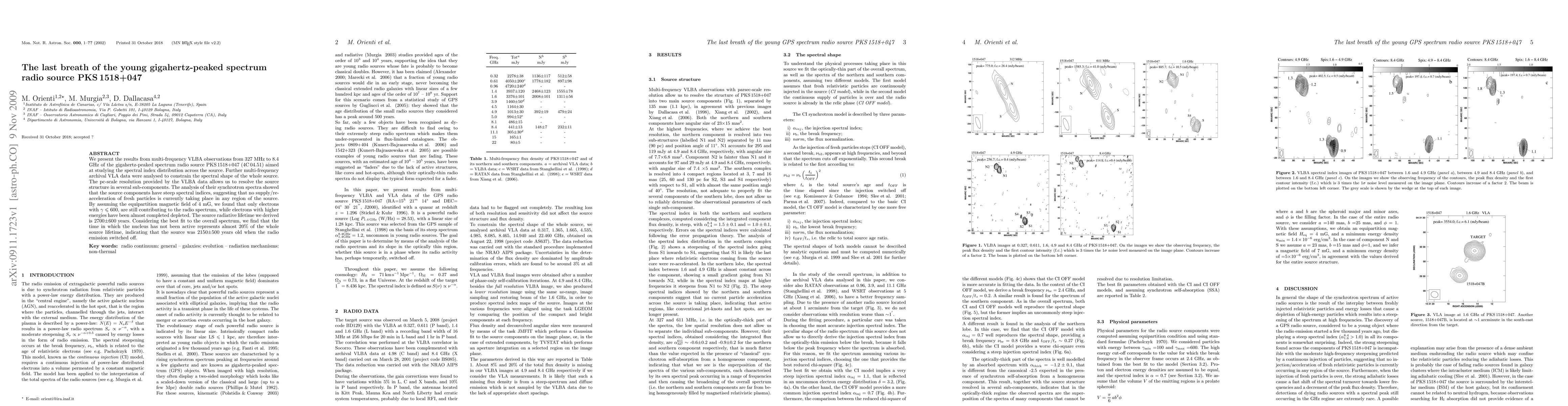 We present the results from multi-frequency VLBA observations from 327 MHz to 8.4 GHz of the gigahertz-peaked spectrum radio source PKS 1518+047 (4C 04.51) aimed at studying the spectral index distribution across the source. Further multi-frequency archival VLA data were analysed to constrain the spectral shape of the whole source. The pc-scale resolution provided by the VLBA data allows us to resolve the source structure in several sub-components. The analysis of their synchrotron spectra showed that the source components have steep spectral indices, suggesting that no supply/re-acceleration of fresh particles is currently taking place in any region of the source. By assuming the equipartition magnetic field of 4 mG, we found that only electrons with $\gamma$ < 600, are still contributing to the radio spectrum, while electrons with higher energies have been almost completed depleted. The source radiative lifetime we derived is 2700+/-600 years. Considering the best fit to the overall spectrum, we find that the time in which the nucleus has not been active represents almost 20% of the whole source lifetime, indicating that the source was 2150+/-500 years old when the radio emission switched off.