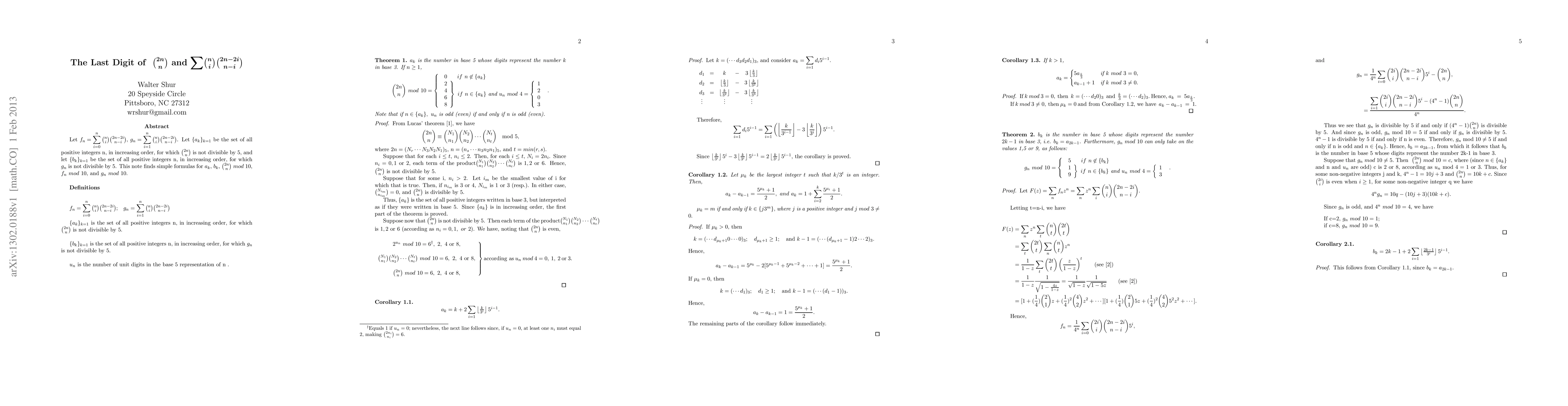 Let $f_{n}=\sum_{i=0}^n \binom{n}{i}\binom{2n-2i}{n-i}$, $g_{n}= \sum_{i=1}^n \binom{n}{i}\binom{2n-2i}{n-i}$. Let $\{a_k\}_{k=1}$ be the set of all positive integers n, in increasing order, for which $\binom{2n}{n}$ is not divisible by 5, and let $\{b_k\}_{k=1}$ be the set of all positive integers n, in increasing order, for which $g_n$ is not divisible by 5. This note finds simple formulas for $a_k$, $b_k$, $\binom{2n}{n}\ mod\ 10$, $ f_{n}\ mod\ 10$, and $ g_{n}\ mod\ 10$.