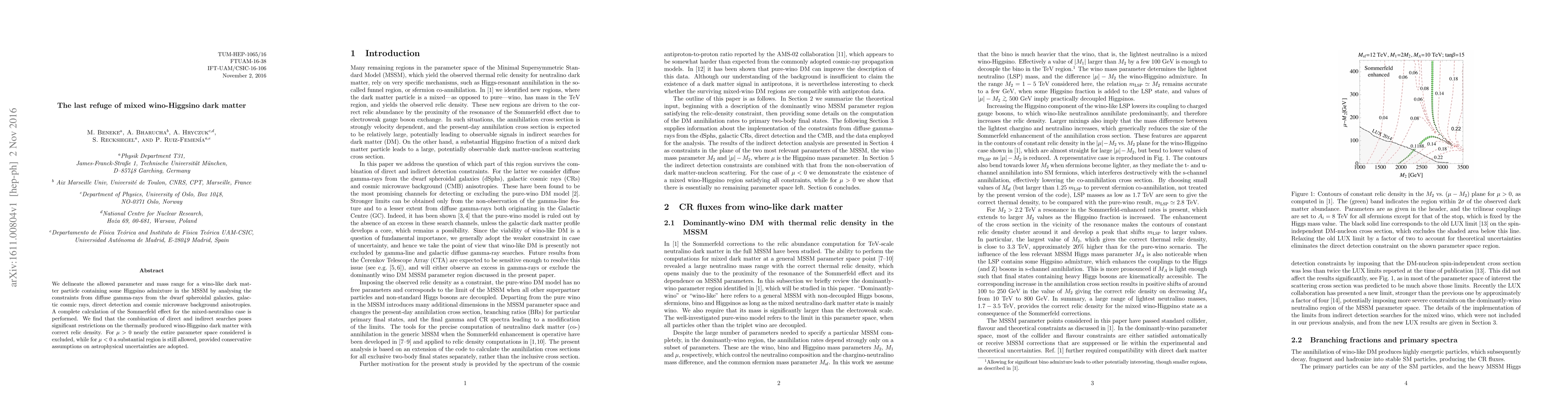 We delineate the allowed parameter and mass range for a wino-like dark matter particle containing some Higgsino admixture in the MSSM by analysing the constraints from diffuse gamma-rays from the dwarf spheroidal galaxies, galactic cosmic rays, direct detection and cosmic microwave background anisotropies. A complete calculation of the Sommerfeld effect for the mixed-neutralino case is performed. We find that the combination of direct and indirect searches poses significant restrictions on the thermally produced wino-Higgsino dark matter with correct relic density. For $\mu>0$ nearly the entire parameter space considered is excluded, while for $\mu<0$ a substantial region is still allowed, provided conservative assumptions on astrophysical uncertainties are adopted.
