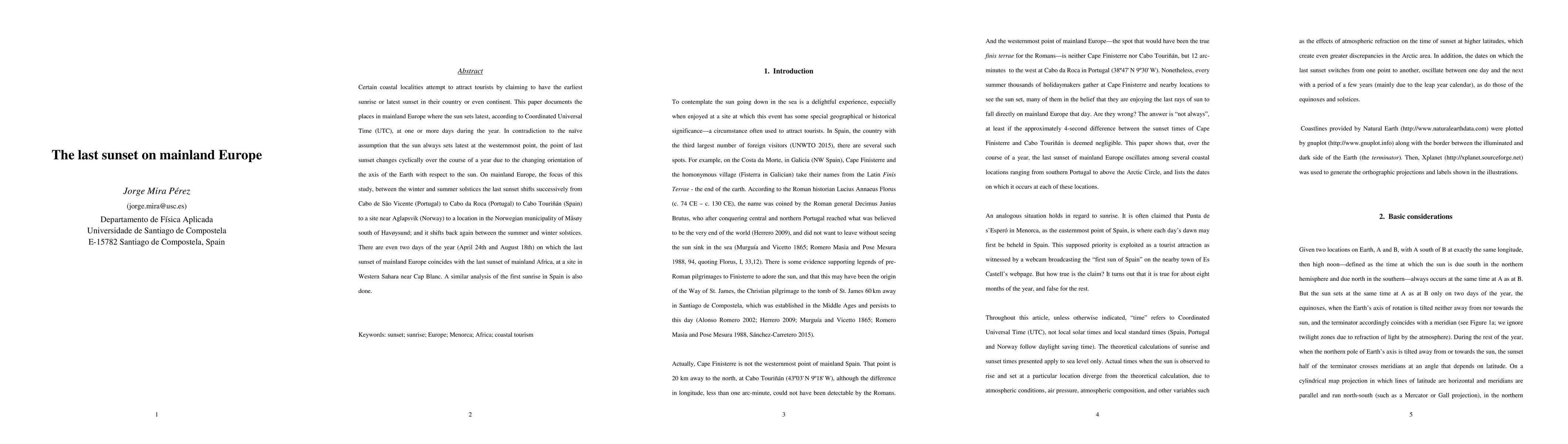 This paper documents the places in mainland Europe at which the sun sets latest, by Coordinated Universal Time (UTC), on any given day (distortion due to differences in local standard times is ignored). In contradiction to the na\"ive assumption that the sun always sets latest at the westernmost point, the point of last sunset changes cyclically over the course of a year due to the changing orientation of the axis of the Earth with respect to the sun. Specifically, between the winter and summer solstices the last sunset shifts successively from Cabo de Sao Vicente (Portugal) to Cabo da Roca (Portugal) to Cabo Tourinan (Spain) to a site near Aglapsvik (Norway) to a location in the Norwegian municipality of Masoy south of Havoysund; and it shifts back again between the summer and winter solstices. There are two days in the year (April 24th and August 18th) on which the last sunset of mainland Europe (shared in those days effectively by Cabo Tourinan and the Aglapsvik area) coincides with the last sunset of mainland Africa, at a site in Western Sahara near Cap Blanc. A similar analysis of the first Spanish sunrise shows that from April 22nd to August 20th it occurs on the Costa Brava at Cap de Creus (Catalonia), and the rest of the year at Punta de s'Espero (Balearic Islands), the easternmost point of Spain.