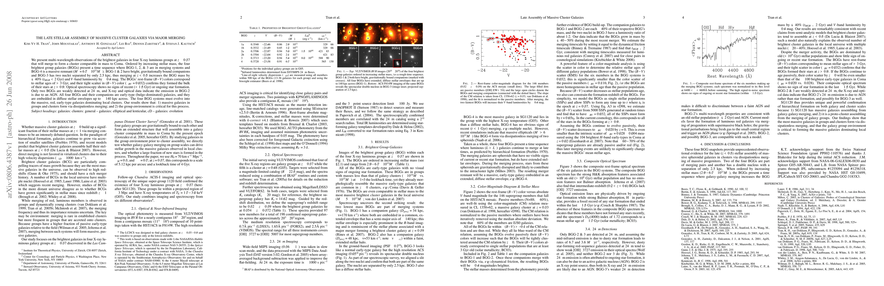 This study uses multi-wavelength observations of four merging bright group galaxies to show that massive cluster galaxies form through major merging events. The galaxies, which are currently in different stages of merging, will evolve into the dominant red, early-type galaxies in local clusters, highlighting the role of group environments in their assembly.