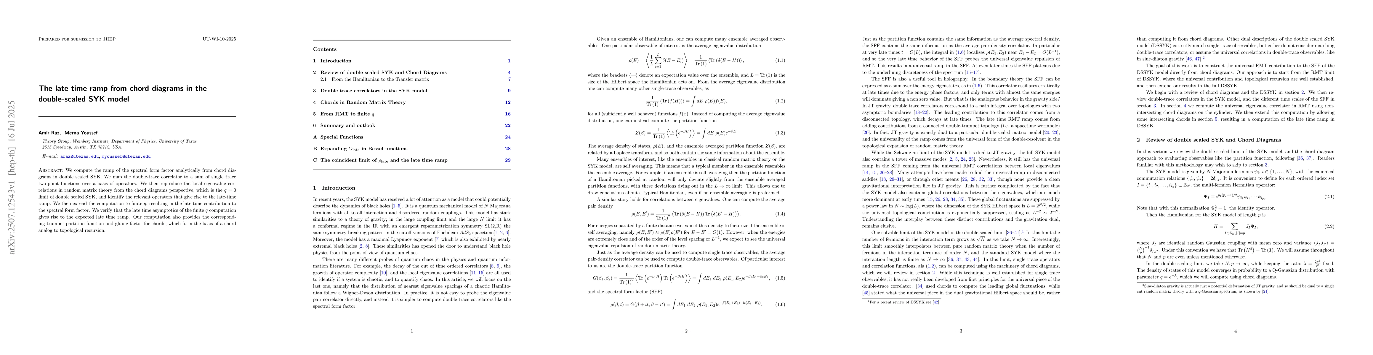 We compute the ramp of the spectral form factor analytically from chord diagrams in double scaled SYK. We map the double-trace correlator to a sum of single trace two-point functions over a basis of operators. We then reproduce the local eigenvalue correlations in random matrix theory from the chord diagrams perspective, which is the $q= 0$ limit of double scaled SYK, and identify the relevant operators that give rise to the late-time ramp. We then extend the computation to finite $q$, resulting in the late time contribution to the spectral form factor. We verify that the late time asymptotics of the finite $q$ computation gives rise to the expected late time ramp. Our computation also provides the corresponding trumpet partition function and gluing factor for chords, which form the basis of a chord analog to topological recursion.