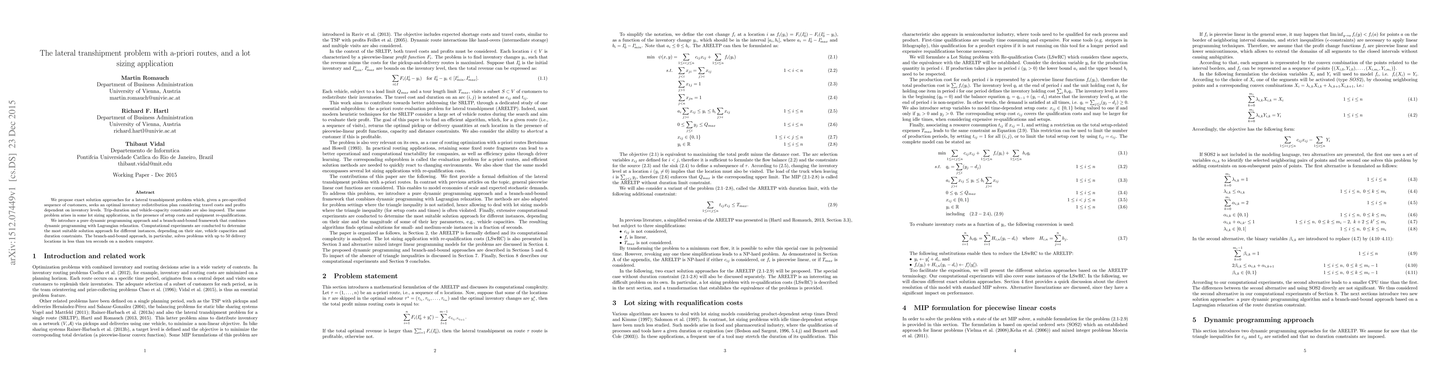 We propose exact solution approaches for a lateral transhipment problem which, given a pre-specified sequence of customers, seeks an optimal inventory redistribution plan considering travel costs and profits dependent on inventory levels. Trip-duration and vehicle-capacity constraints are also imposed. The same problem arises in some lot sizing applications, in the presence of setup costs and equipment re-qualifications. We introduce a pure dynamic programming approach and a branch-and-bound framework that combines dynamic programming with Lagrangian relaxation. Computational experiments are conducted to determine the most suitable solution approach for different instances, depending on their size, vehicle capacities and duration constraints. The branch-and-bound approach, in particular, solves problems with up to 50 delivery locations in less than ten seconds on a modern computer.