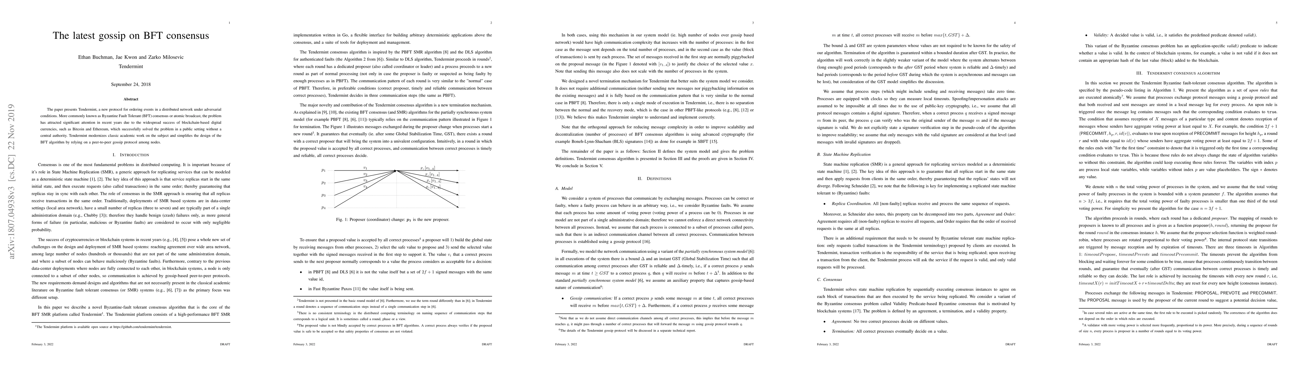 The paper presents Tendermint, a new protocol for ordering events in a distributed network under adversarial conditions. More commonly known as Byzantine Fault Tolerant (BFT) consensus or atomic broadcast, the problem has attracted significant attention in recent years due to the widespread success of blockchain-based digital currencies, such as Bitcoin and Ethereum, which successfully solved the problem in a public setting without a central authority. Tendermint modernizes classic academic work on the subject and simplifies the design of the BFT algorithm by relying on a peer-to-peer gossip protocol among nodes.