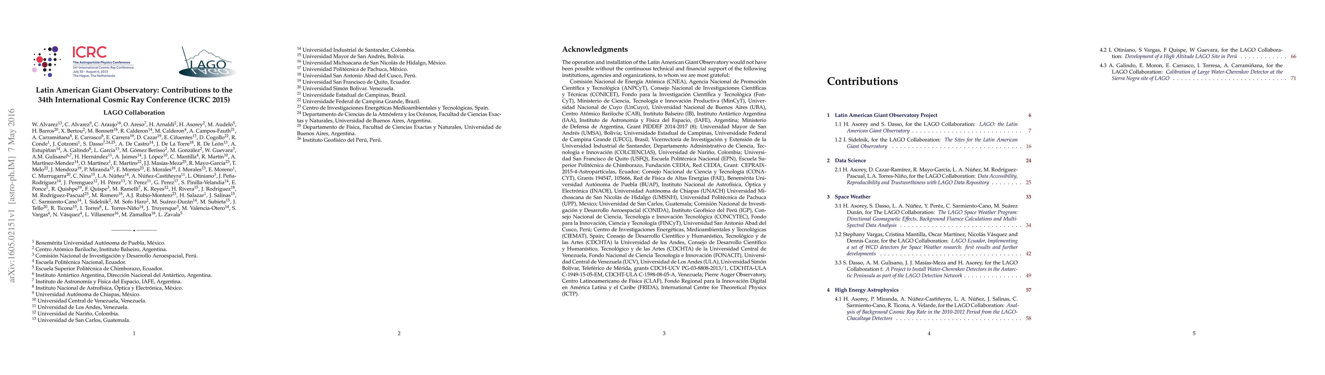 The Latin American Giant Observatory (LAGO) is an extended cosmic ray observatory composed by a network of water-Cherenkov detectors spanning over different sites located at significantly different altitudes (from sea level up to more than $5000$\,m a.s.l.) and latitudes across Latin America, covering a huge range of geomagnetic rigidity cut-offs and atmospheric absorption/reaction levels. This detection network is designed to measure the temporal evolution of the radiation flux at ground level with extreme detail. The LAGO project is mainly oriented to perform basic research in three branches: high energy phenomena, space weather and atmospheric radiation at ground level. LAGO is built and operated by the LAGO Collaboration, a non-centralized collaborative union of more than 30 institutions from ten countries. These are the contributions of the LAGO Collaboration to the 34th International Cosmic Ray Conference, 30 July - 6 August 2015, The Hague, The Netherlands