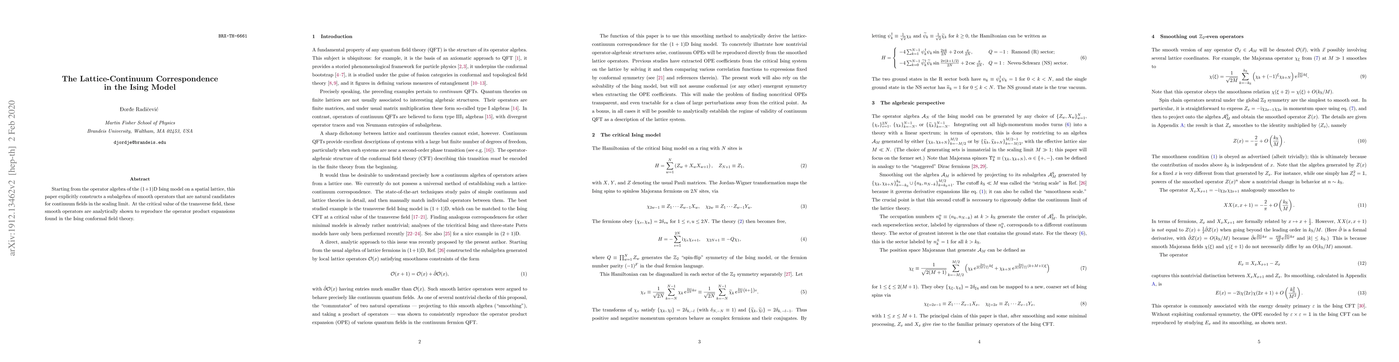 Starting from the operator algebra of the (1+1)D Ising model on a spatial lattice, this paper explicitly constructs a subalgebra of smooth operators that are natural candidates for continuum fields in the scaling limit. At the critical value of the transverse field, these smooth operators are analytically shown to reproduce the operator product expansions found in the Ising conformal field theory.