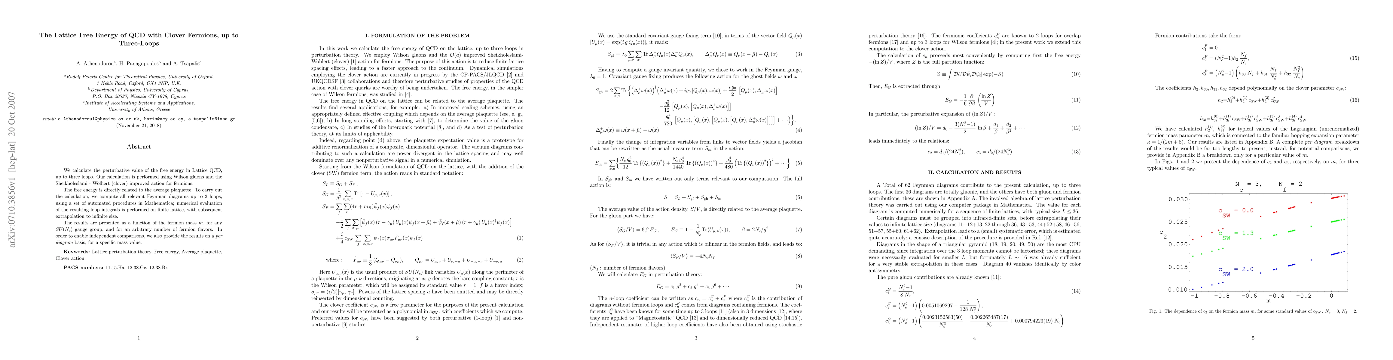 We calculate the perturbative value of the free energy in Lattice QCD, up to three loops. Our calculation is performed using Wilson gluons and the Sheikholeslami - Wolhert (clover) improved action for fermions. The free energy is directly related to the average plaquette. To carry out the calculation, we compute all relevant Feynman diagrams up to 3 loops, using a set of automated procedures in Mathematica; numerical evaluation of the resulting loop integrals is performed on finite lattice, with subsequent extrapolation to infinite size. The results are presented as a function of the fermion mass m, for any SU(N_c) gauge group, and for an arbitrary number of fermion flavors. In order to enable independent comparisons, we also provide the results on a per diagram basis, for a specific mass value.