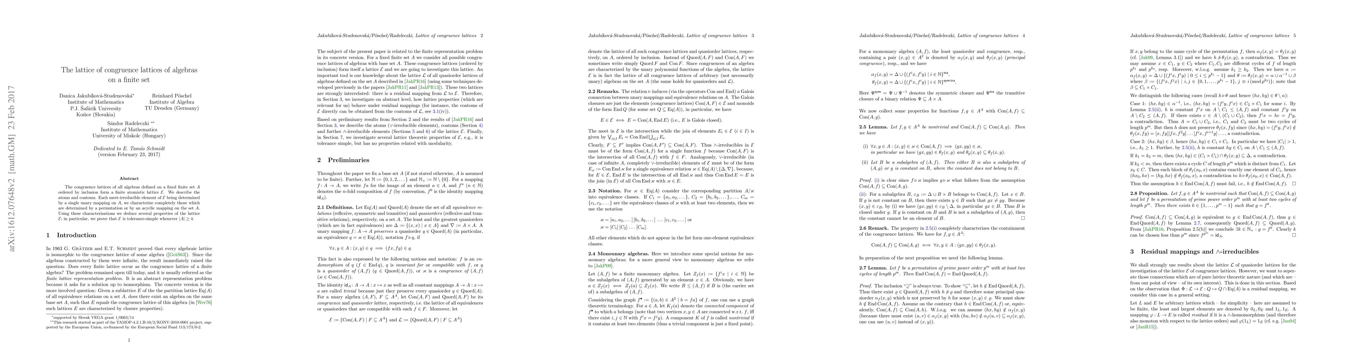 This paper studies the lattice $\mathcal E$ formed by the inclusion-ordered congruence lattices of all algebras on a finite set $A$. It characterizes the atoms and coatoms of $\mathcal E$, particularly identifying meet-irreducible elements determined by unary mappings, and proves that $\mathcal E$ is tolerance-simple when $|A|\geq 4$.