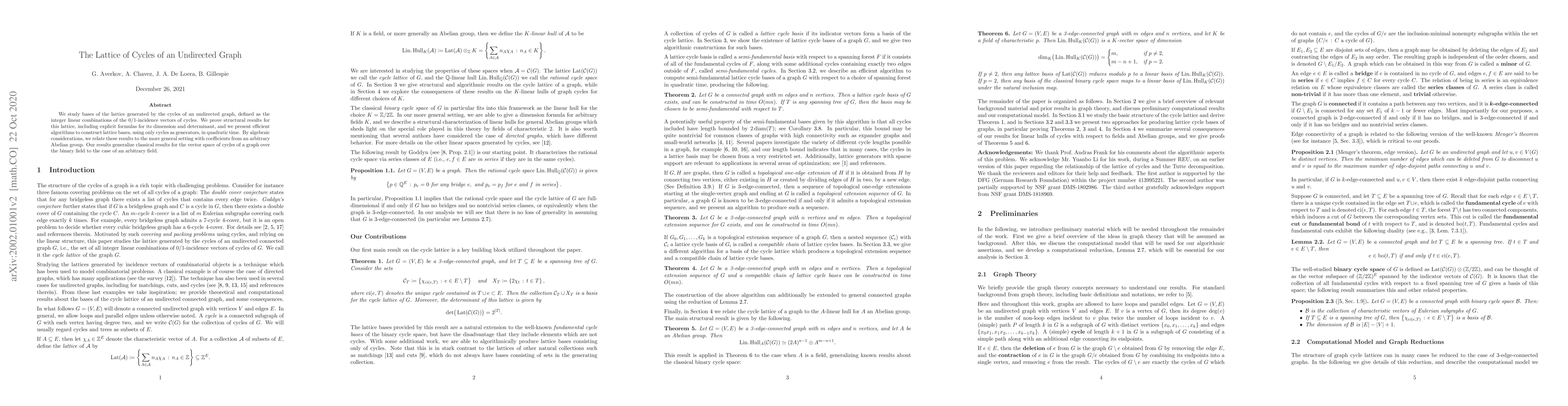 We study bases of the lattice generated by the cycles of an undirected graph, defined as the integer linear combinations of the 0/1-incidence vectors of cycles. We prove structural results for this lattice, including explicit formulas for its dimension and determinant, and we present efficient algorithms to construct lattice bases, using only cycles as generators, in quadratic time. By algebraic considerations, we relate these results to the more general setting with coefficients from an arbitrary Abelian group. Our results generalize classical results for the vector space of cycles of a graph over the binary field to the case of an arbitrary field.