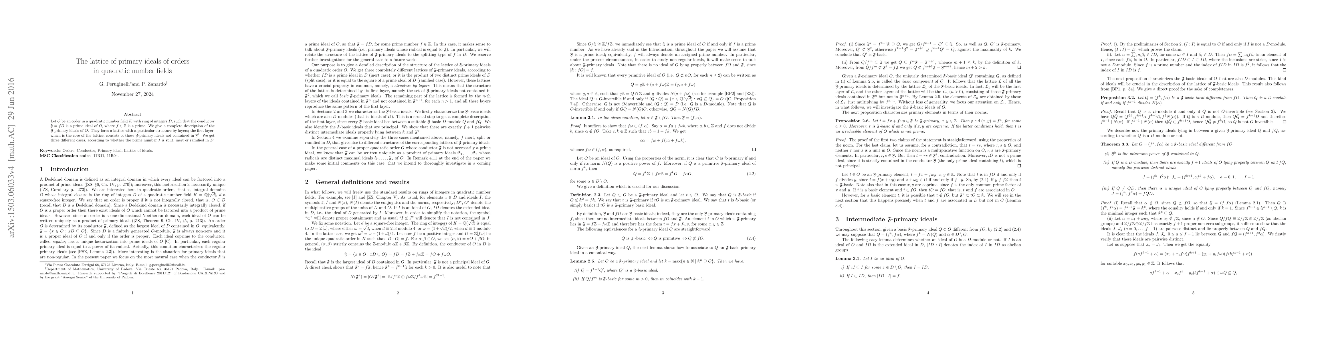 This paper describes the lattice of primary ideals in orders within quadratic number fields, categorizing them based on whether a prime ideal is split, inert or ramified.