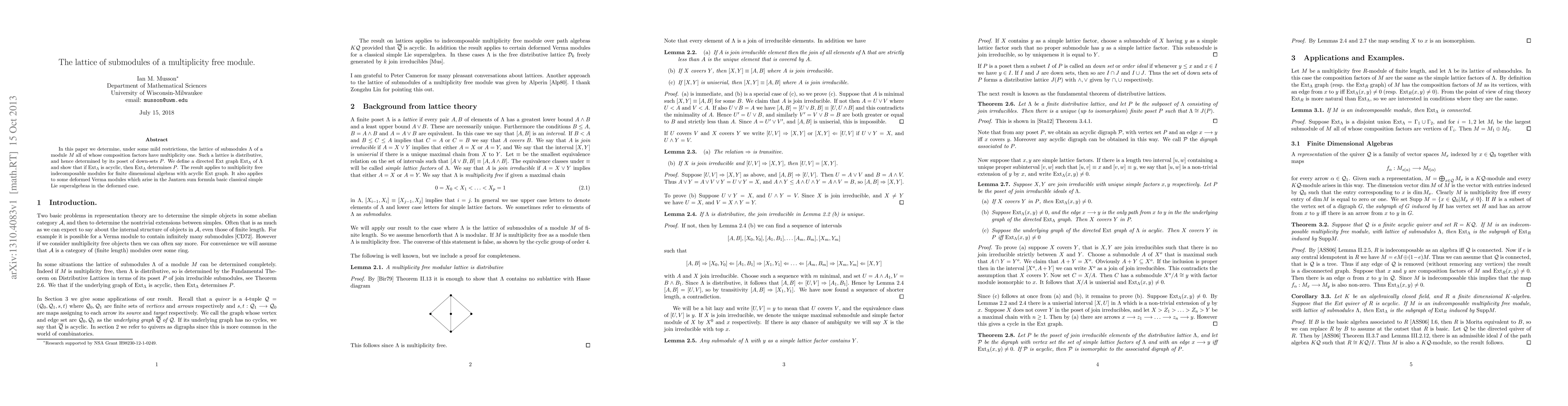 In this paper we determine, under some mild restrictions, the lattice of submodules $\gL$ of a module $M$ all of whose composition factors have multiplicity one. Such a lattice is distributive, and hence determined by its poset of down-sets $P$. We define a directed Ext graph $\Ext_\gL$ of $\gL$ and show that if $\Ext_\gL$ is acyclic, then $\Ext_\gL$ determines $P$. The result applies to multiplicity free indecomposable modules for finite dimensional algebras with acyclic Ext graph. It also applies to some deformed Verma modules which arise in the Jantzen sum formula basic classical simple Lie superalgebras in the deformed case.