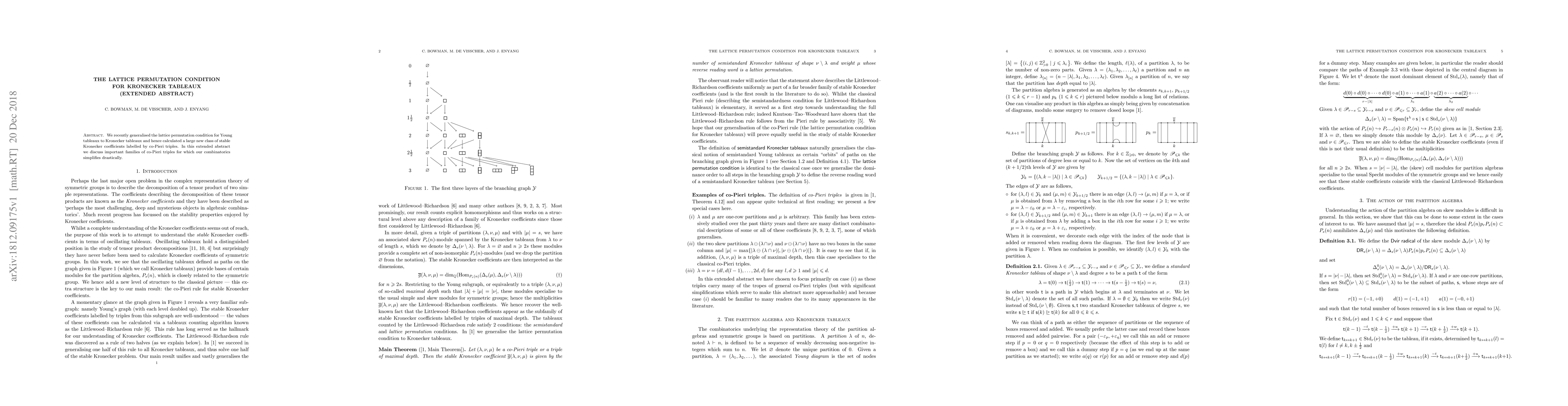 Summary: This extended abstract discusses the generalization of the lattice permutation condition from Young to Kronecker tableaux, revealing a new class of stable Kronecker coefficients through simplified combinatorics for specific families of co-Pieri triples.