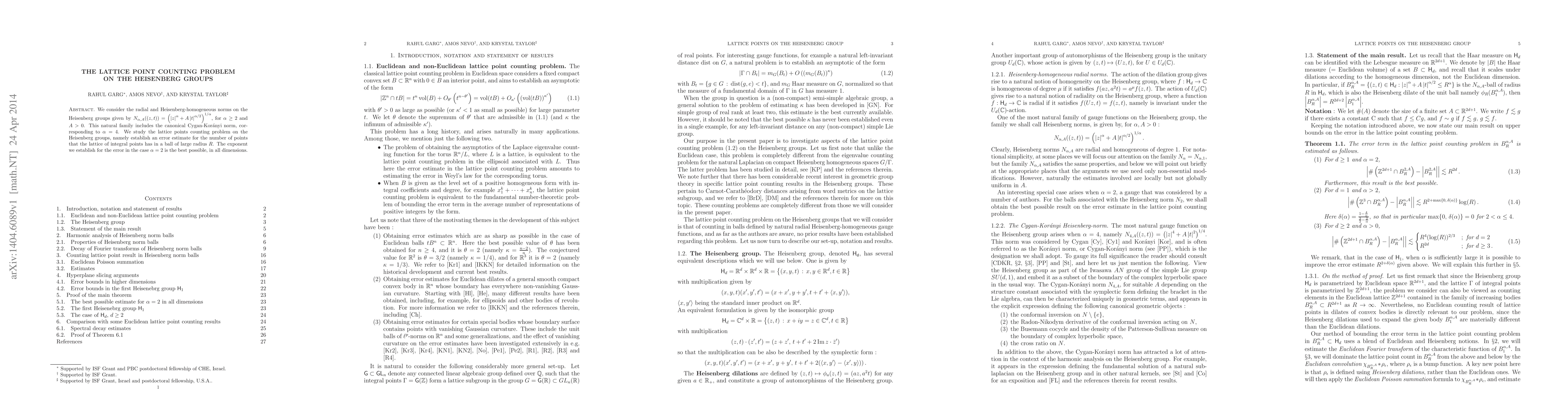 We consider the radial and Heisenberg-homogeneous norms on the Heisenberg groups given by $N_{\alpha,A}((z,t)) = \left(|z|^\alpha + A |t|^{\alpha/2}\right)^{1/\alpha}$, for $\alpha \ge 2$ and $A>0$. This natural family includes the canonical Cygan-Kor\'anyi norm, corresponding to $\alpha =4$. We study the lattice points counting problem on the Heisenberg groups, namely establish an error estimate for the number of points that the lattice of integral points has in a ball of large radius $R$. The exponent we establish for the error in the case $\alpha=2$ is the best possible, in all dimensions.