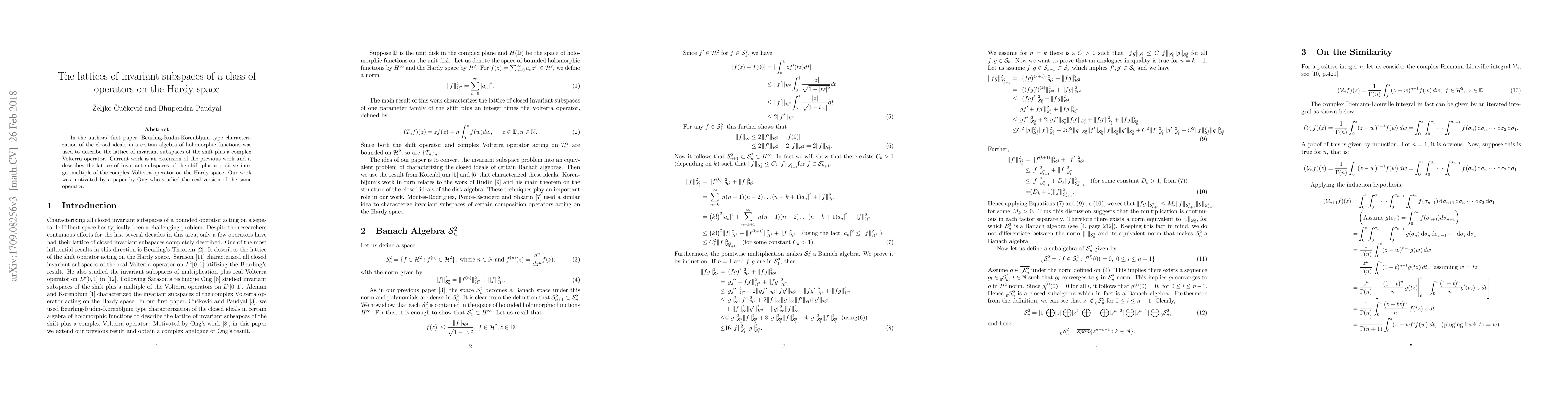 In the authors' first paper, Beurling-Rudin-Korenbljum type characterization of the closed ideals in a certain algebra of holomorphic functions was used to describe the lattice of invariant subspaces of the shift plus a complex Volterra operator. Current work is an extension of the previous work and it describes the lattice of invariant subspaces of the shift plus a positive integer multiple of the complex Volterra operator on the Hardy space. Our work was motivated by a paper by Ong who studied the real version of the same operator.
