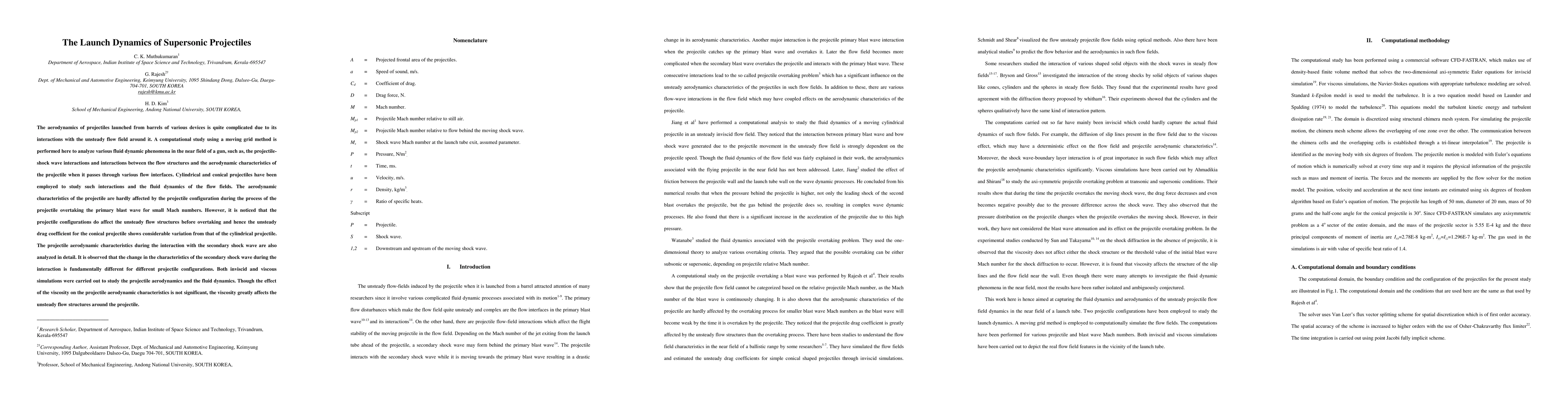 This research uses computational simulations to study how supersonic projectile shapes (cylindrical and conical) interact with shock waves during launch. Key findings show that projectile configuration impacts unsteady flow structures and drag, but viscosity's effect on aerodynamics is negligible. Both inviscid and viscous simulations were conducted to analyze these interactions.