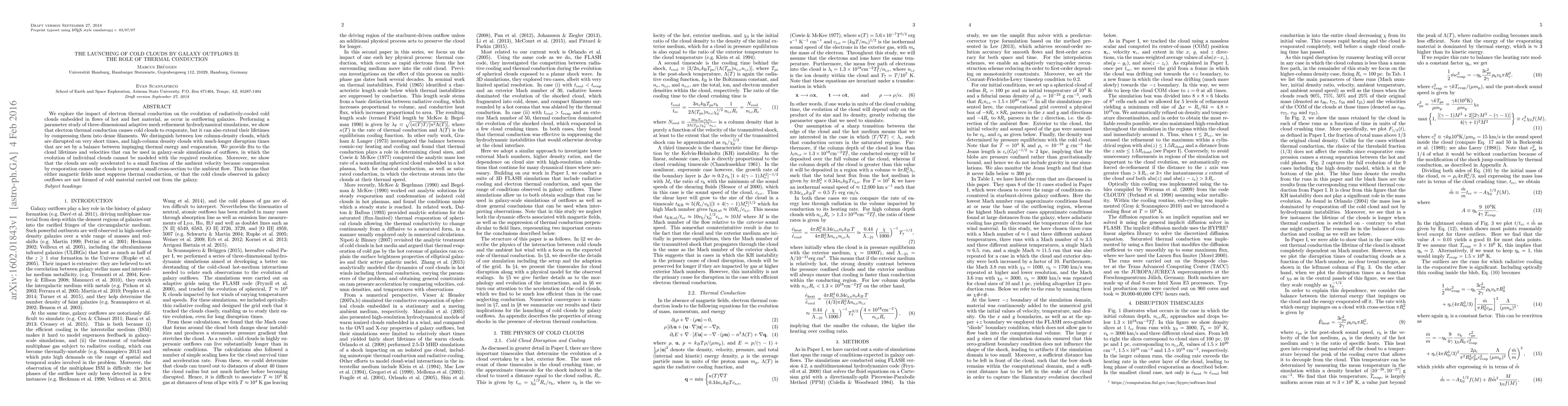 This paper investigates how electron thermal conduction influences the evolution of cold clouds in galaxy outflows, demonstrating that while it causes evaporation, it can also compress clouds into dense filaments, extending their lifetimes. The study provides empirical fits for cloud lifetimes and velocities, suggesting that magnetic fields may suppress thermal conduction or that observed cold clouds are not purely from galactic material.