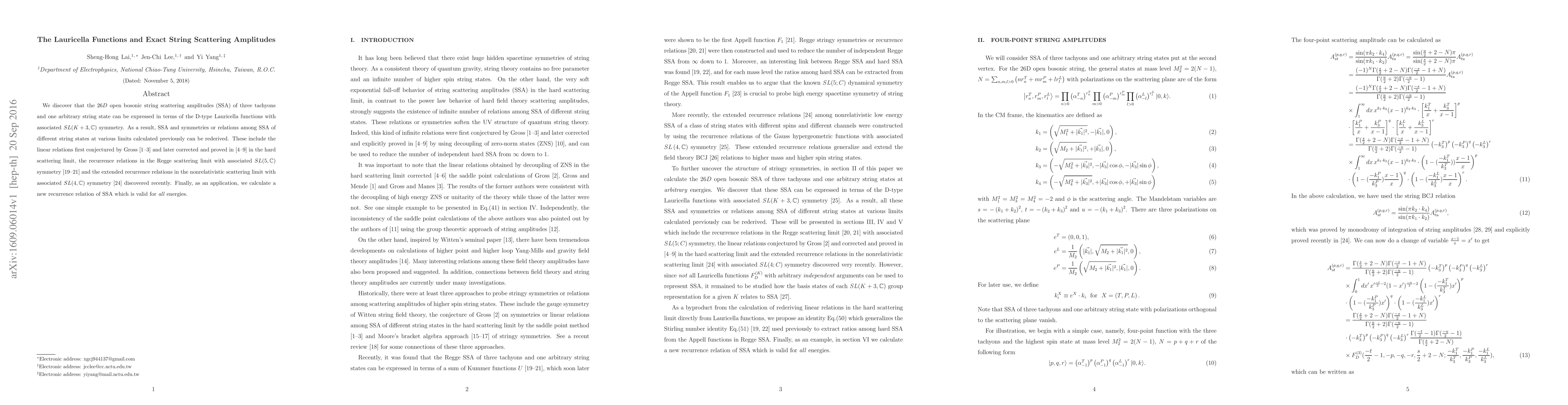 We discover that the 26D open bosonic string scattering amplitudes (SSA) of three tachyons and one arbitrary string state can be expressed in terms of the D-type Lauricella functions with associated SL(K+3,C) symmetry. As a result, SSA and symmetries or relations among SSA of different string states at various limits calculated previously can be rederived. These include the linear relations first conjectured by Gross [1-3] and later corrected and proved in [4-9] in the hard scattering limit, the recurrence relations in the Regge scattering limit with associated SL(5,C) symmetry [19-21] and the extended recurrence relations in the nonrelativistic scattering limit with associated SL(4,C) symmetry [24] discovered recently. Finally, as an application, we calculate a new recurrence relation of SSA which is valid for all energies.