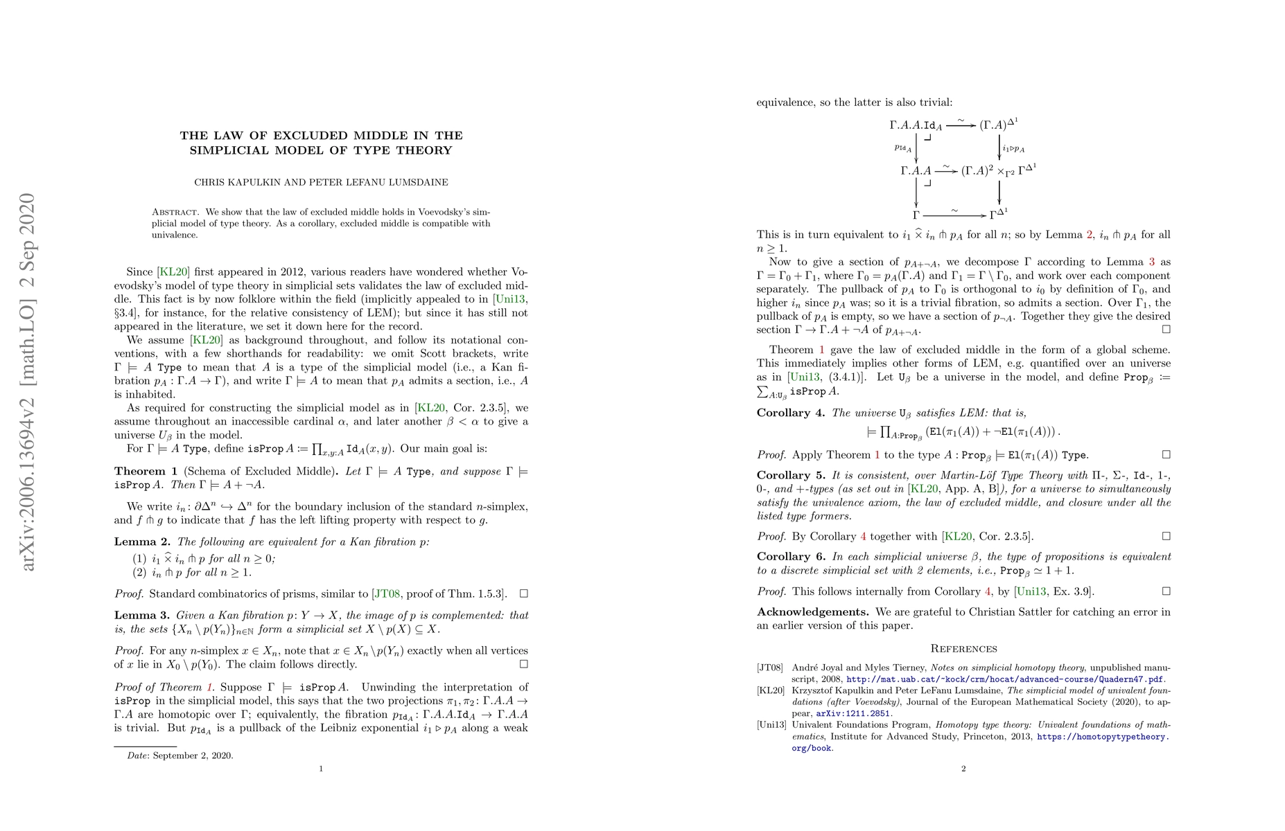 Summary: This paper demonstrates that the law of excluded middle is valid within Voevodsky's simplicial model of type theory, thereby confirming its compatibility with univalence.