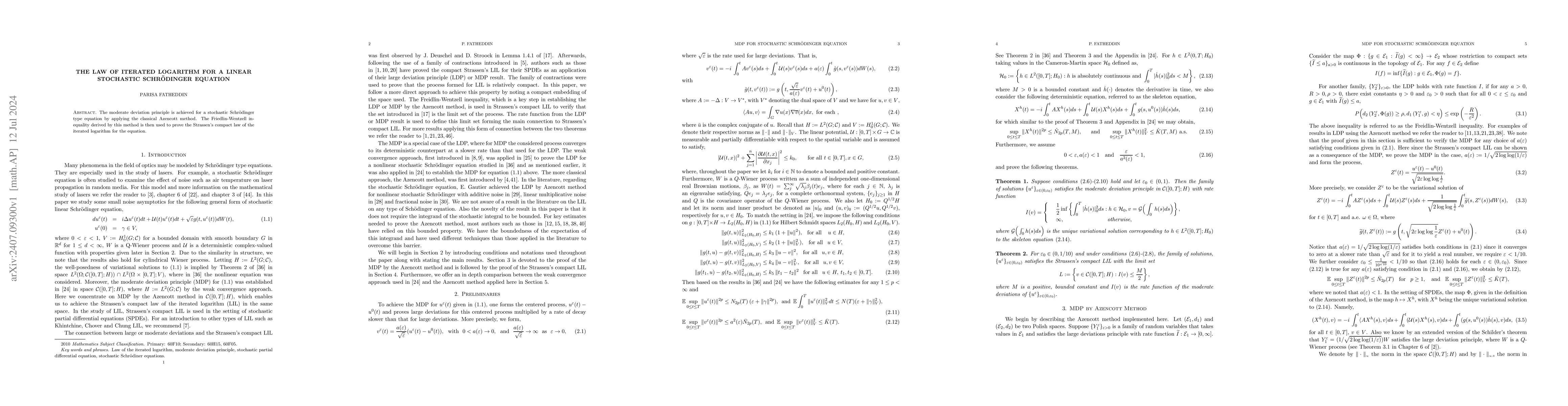 The paper establishes a moderate deviation principle for a stochastic Schrödinger equation using the Azencott method, subsequently proving Strassen's law of the iterated logarithm via the Friedlin-Wentzell inequality.