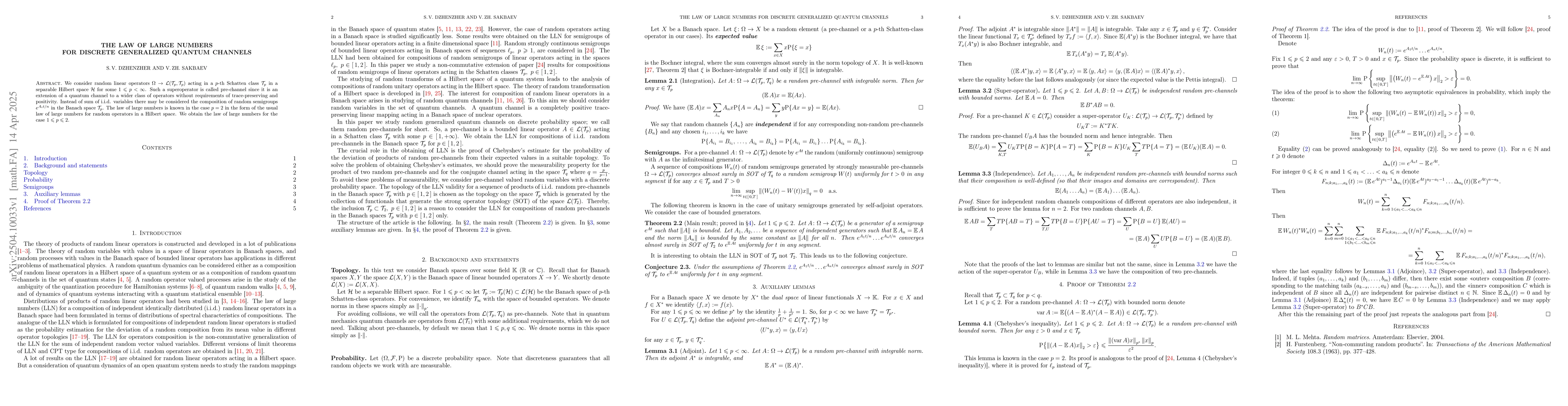 The research investigates random linear operators acting in the p-th Schatten class, extending quantum channels to a broader class without trace-preserving and positivity requirements. It considers the composition of random semigroups e^(A_i t/n) in the Banach space T_p, extending the law of large numbers known for p=2 to the case 1≤p≤2.