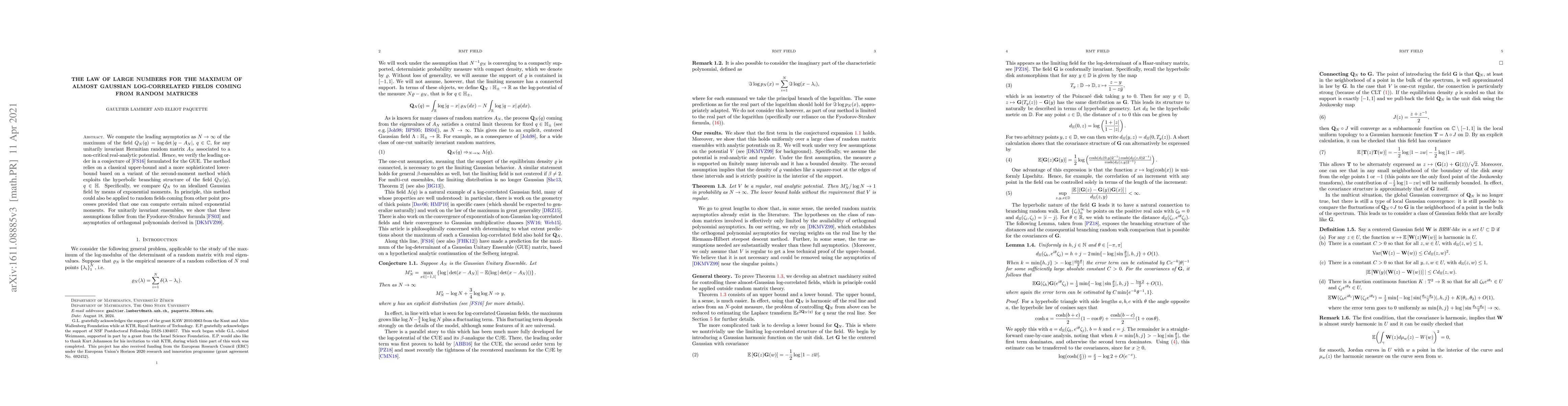 The paper verifies a conjecture about the maximum of almost Gaussian log-correlated fields coming from random matrices, using a novel method that compares the field to an idealized Gaussian field via exponential moments. The results show the leading asymptotics as N approaches infinity.