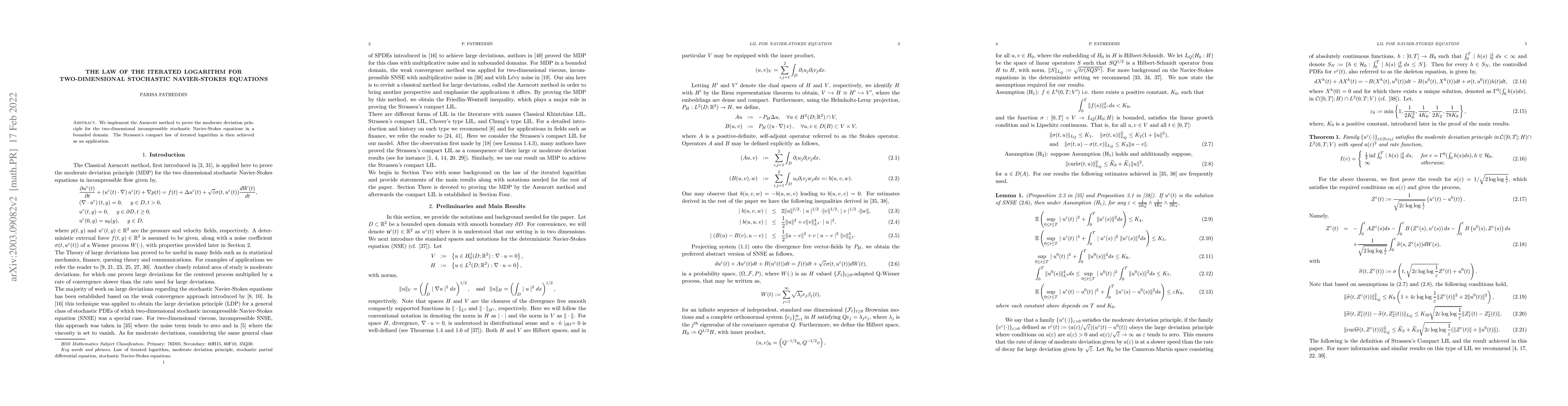 The paper employs the Azencott method to establish a moderate deviation principle for the two-dimensional stochastic Navier-Stokes equations. It also proves two forms of the law of the iterated logarithm: the Khintchine Classical type and Strassen's compact version.