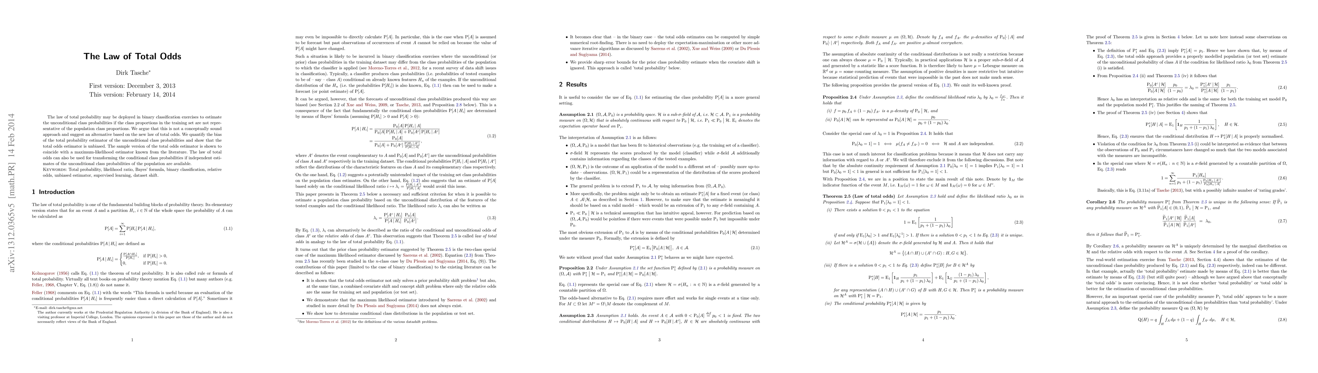 The law of total probability may be deployed in binary classification exercises to estimate the unconditional class probabilities if the class proportions in the training set are not representative of the population class proportions. We argue that this is not a conceptually sound approach and suggest an alternative based on the new law of total odds. We quantify the bias of the total probability estimator of the unconditional class probabilities and show that the total odds estimator is unbiased. The sample version of the total odds estimator is shown to coincide with a maximum-likelihood estimator known from the literature. The law of total odds can also be used for transforming the conditional class probabilities if independent estimates of the unconditional class probabilities of the population are available. Keywords: Total probability, likelihood ratio, Bayes' formula, binary classification, relative odds, unbiased estimator, supervised learning, dataset shift.