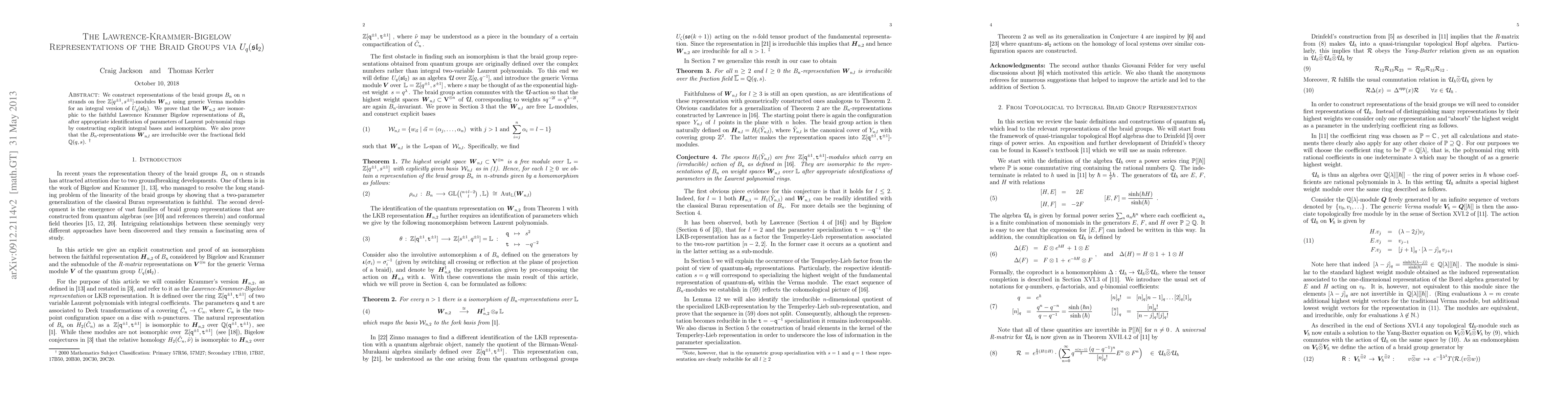 We construct representations of the braid groups B_n on n strands on free Z[q,q^-1,s,s^-1]-modules W_{n,l} using generic Verma modules for an integral version of quantum sl_2. We prove that the W_{n,2} are isomorphic to the faithful Lawrence Krammer Bigelow representations of B_n after appropriate identification of parameters of Laurent polynomial rings by constructing explicit integral bases and isomorphism. We also prove that the B_n-representations W_{n,l} are irreducible over the fractional field Q (q,s).