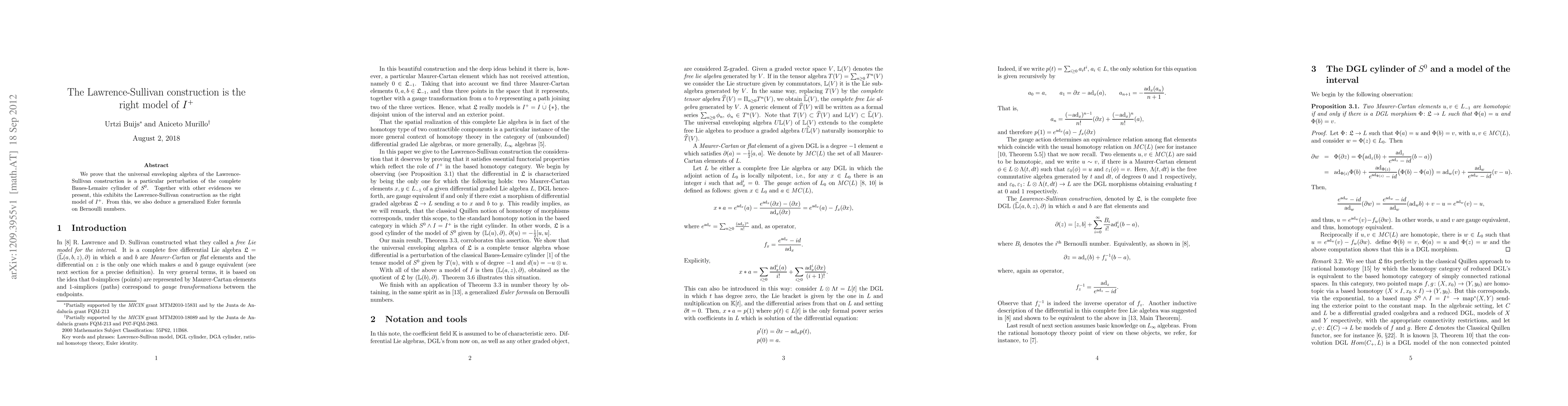 We prove that the universal enveloping algebra of the Lawrence-Sullivan construction is a particular perturbation of the complete Baues-Lemaire cylinder of $S^0$. Together with other evidences we present, this exhibits the Lawrence-Sullivan construction as the right model of $I^+$. From this, we also deduce a generalized Euler formula on Bernoulli numbers.