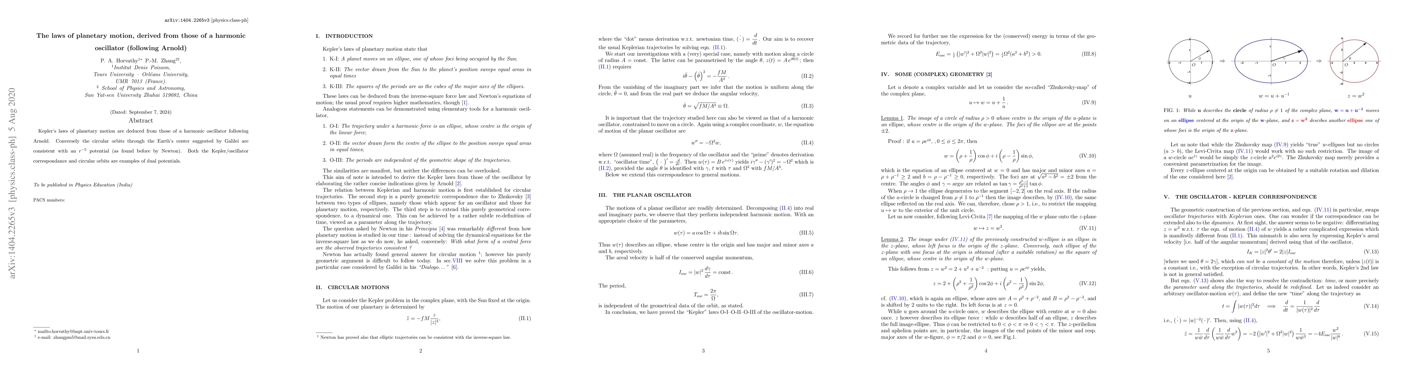 Kepler's laws of planetary motion are deduced from those of a harmonic oscillator following Arnold. Conversely, the circular orbits through the Earth's center suggested by Galilei are consistent with an $r^{-5}$ potential as found before by Newton. Both the Kepler/oscillator correspondance and circular orbits are examples of dual potentials.
