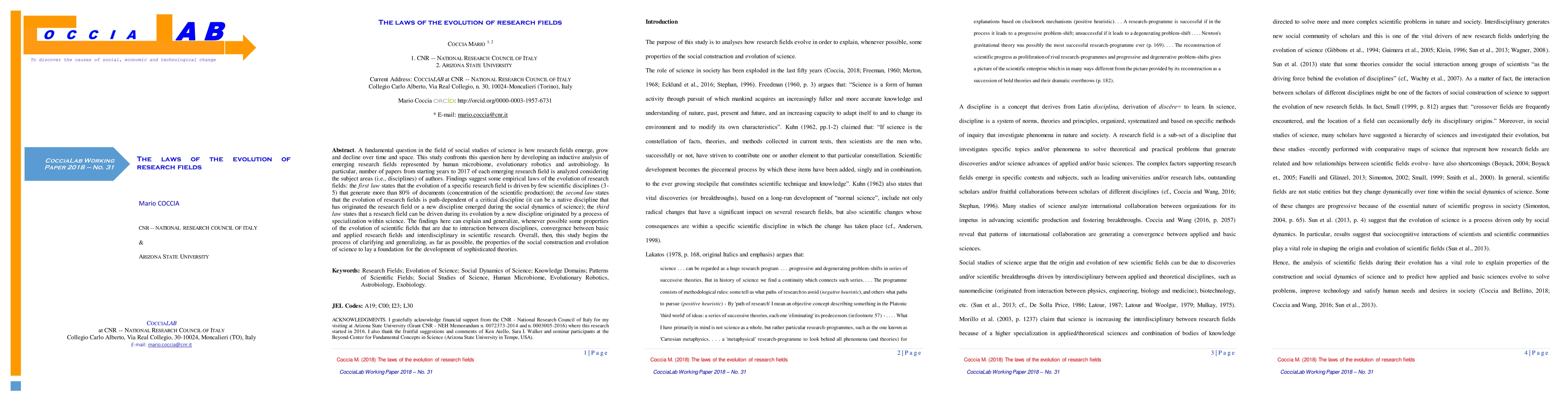 A fundamental question in the field of social studies of science is how research fields emerge, grow and decline over time and space. This study confronts this question here by developing an inductive analysis of emerging research fields represented by human microbiome, evolutionary robotics and astrobiology. In particular, number of papers from starting years to 2017 of each emerging research field is analyzed considering the subject areas (i.e., disciplines) of authors. Findings suggest some empirical laws of the evolution of research fields: the first law states that the evolution of a specific research field is driven by few scientific disciplines (3- 5) that generate more than 80% of documents (concentration of the scientific production); the second law states that the evolution of research fields is path-dependent of a critical discipline (it can be a native discipline that has originated the research field or a new discipline emerged during the social dynamics of science); the third law states that a research field can be driven during its evolution by a new discipline originated by a process of specialization within science. The findings here can explain and generalize, whenever possible some properties of the evolution of scientific fields that are due to interaction between disciplines, convergence between basic and applied research fields and interdisciplinary in scientific research. Overall, then, this study begins the process of clarifying and generalizing, as far as possible, the properties of the social construction and evolution of science to lay a foundation for the development of sophisticated theories.