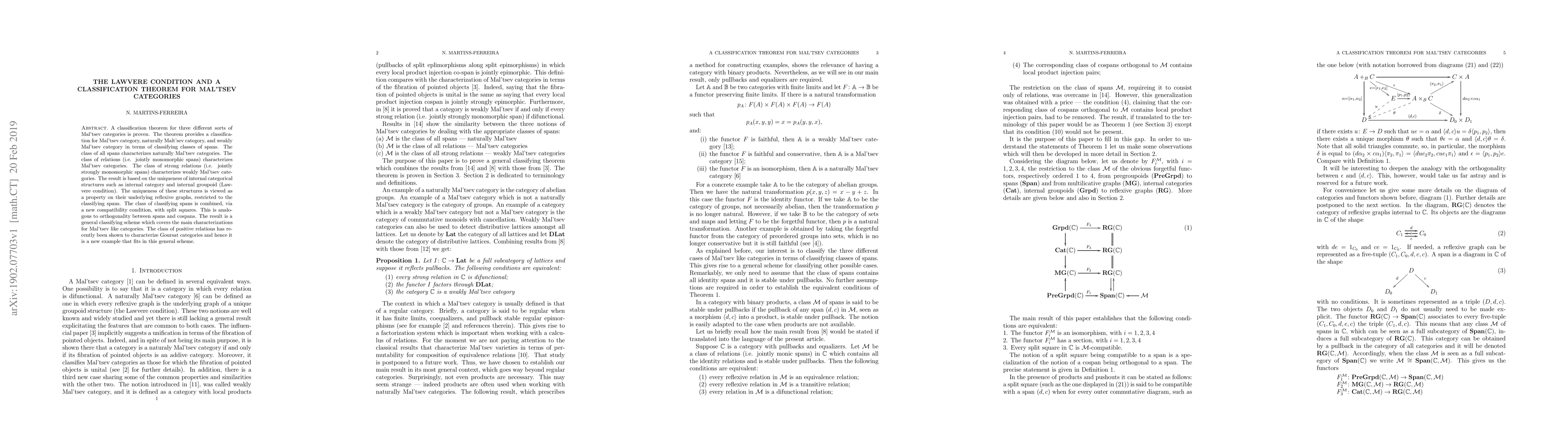 This paper proves a classification theorem for three types of Mal'tsev categories using spans, relations, and strong relations. It leverages the Lawvere condition to show that naturally Mal'tsev categories are characterized by spans, Mal'tsev categories by relations, and weakly Mal'tsev categories by strong relations.