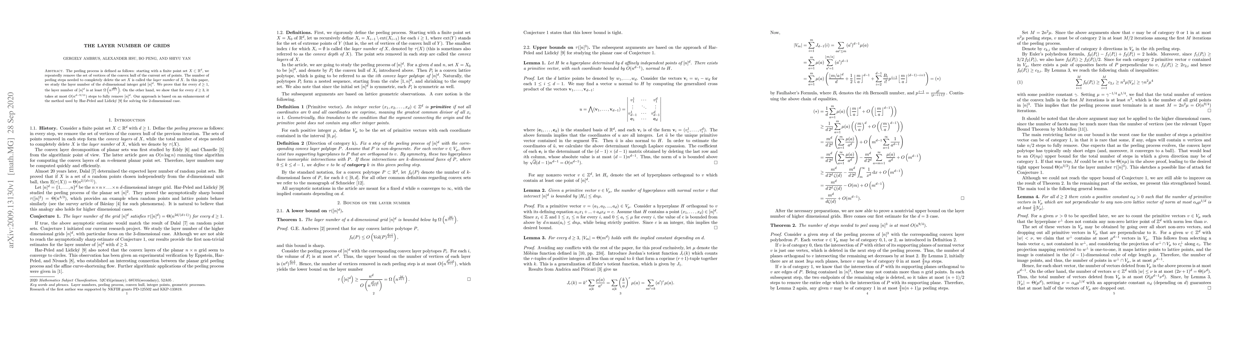 The peeling process is defined as follows: starting with a finite point set $X \subset \mathbb{R}^d$, we repeatedly remove the set of vertices of the convex hull of the current set of points. The number of peeling steps needed to completely delete the set $X$ is called the layer number of $X$. In this paper, we study the layer number of the $d$-dimensional integer grid $[n]^d$. We prove that for every $d \geq 1$, the layer number of $[n]^d$ is at least $\Omega\left(n^\frac{2d}{d+1}\right)$. On the other hand, we show that for every $d\geq 3$, it takes at most $O(n^{d - 9/11})$ steps to fully remove $[n]^d$. Our approach is based on an enhancement of the method used by Har-Peled and Lidick\'{y} for solving the 2-dimensional case.