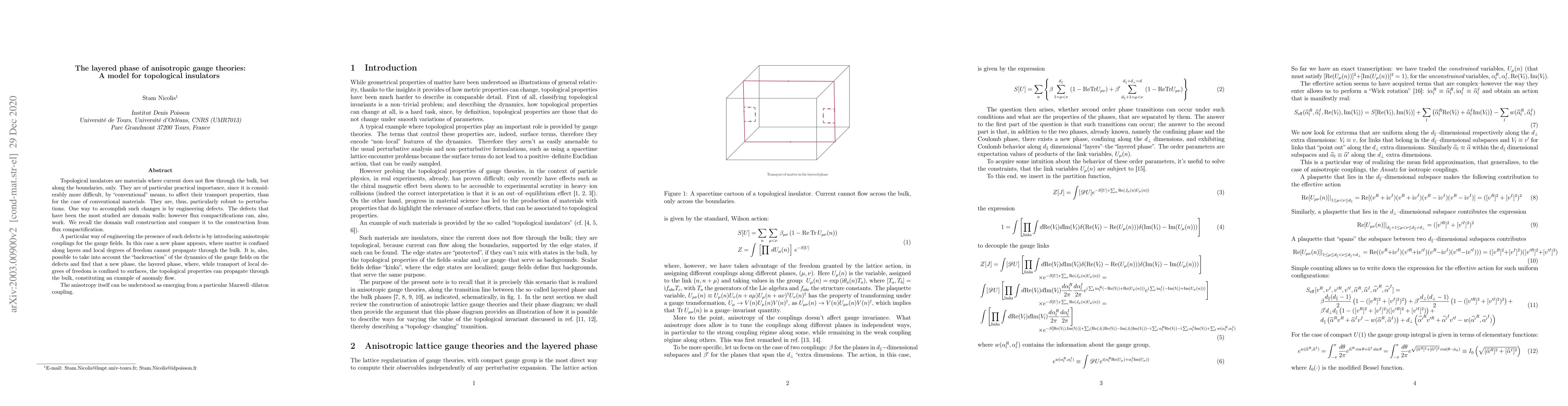 This paper explores the layered phase in anisotropic gauge theories, demonstrating how topological insulators can exhibit robust transport properties along boundaries while confining matter to layers. It introduces anisotropic couplings to gauge fields to engineer defects and highlights the emergence of a new phase where topological properties propagate through the bulk.