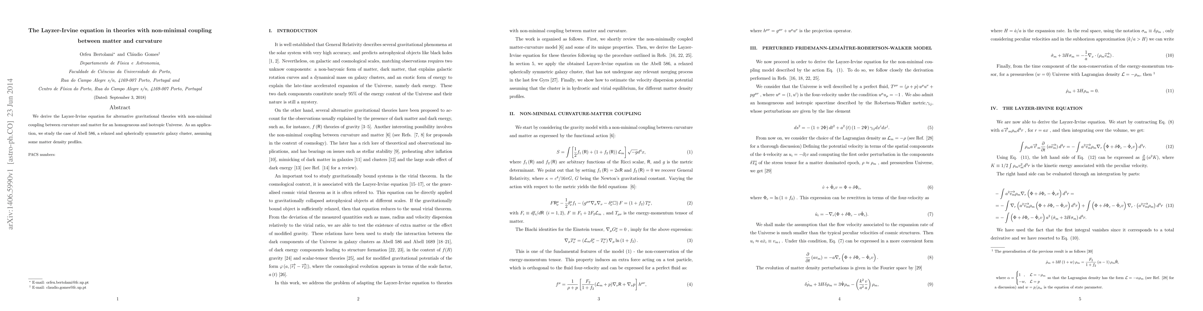 Summary: This paper derives the Layzer-Irvine equation for gravitational theories with non-minimal coupling in an homogeneous and isotropic universe, and applies it to study the matter density profiles in the galaxy cluster Abell 586.