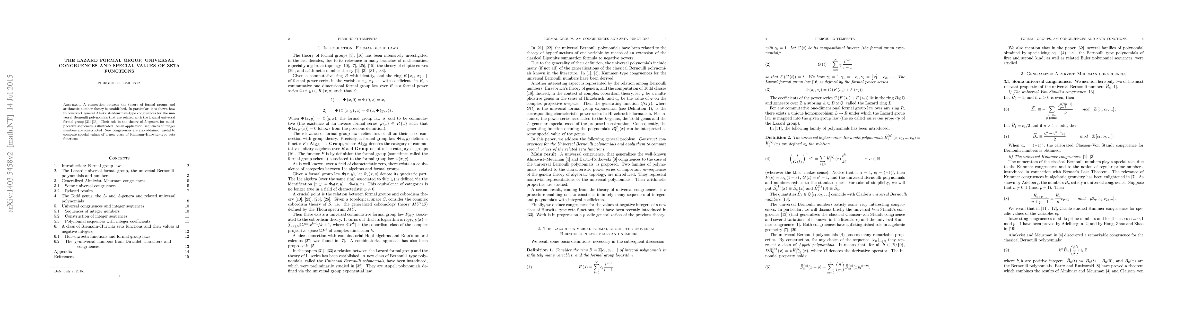 A connection between the theory of formal groups and arithmetic number theory is established. In particular, it is shown how to construct general Almkvist--Meurman--type congruences for the universal Bernoulli polynomials that are related with the Lazard universal formal group \cite{Tempesta1}-\cite{Tempesta3}. Their role in the theory of $L$--genera for multiplicative sequences is illustrated. As an application, sequences of integer numbers are constructed. New congruences are also obtained, useful to compute special values of a new class of Riemann--Hurwitz--type zeta functions.