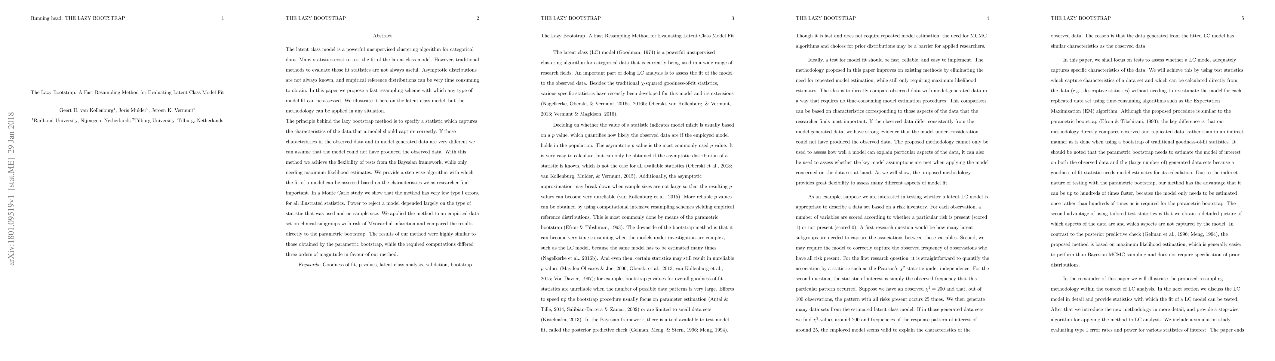 This paper proposes a fast resampling method called the "lazy bootstrap" to evaluate the fit of latent class models for categorical data. Unlike traditional methods, this approach requires minimal computation and achieves low type I errors, demonstrating high similarity to parametric bootstrap results but with significantly lower computational cost.