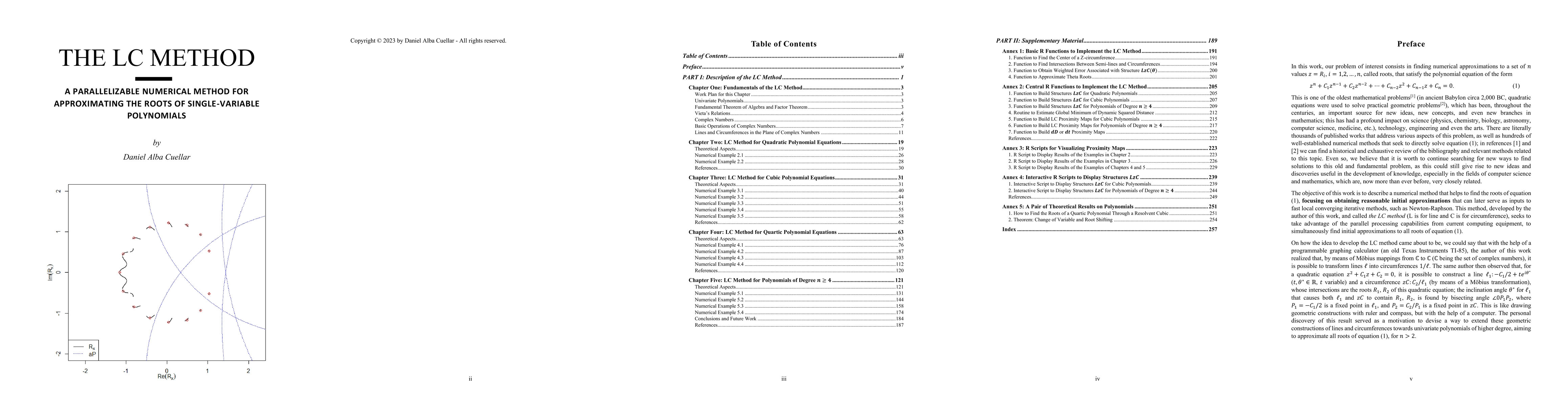 The LC method approximates roots of single-variable polynomials using geometric structures of Lines L and Circumferences C, leveraging parallel processing for efficiency. It provides R programs for reproducing results and encourages further development of the method.