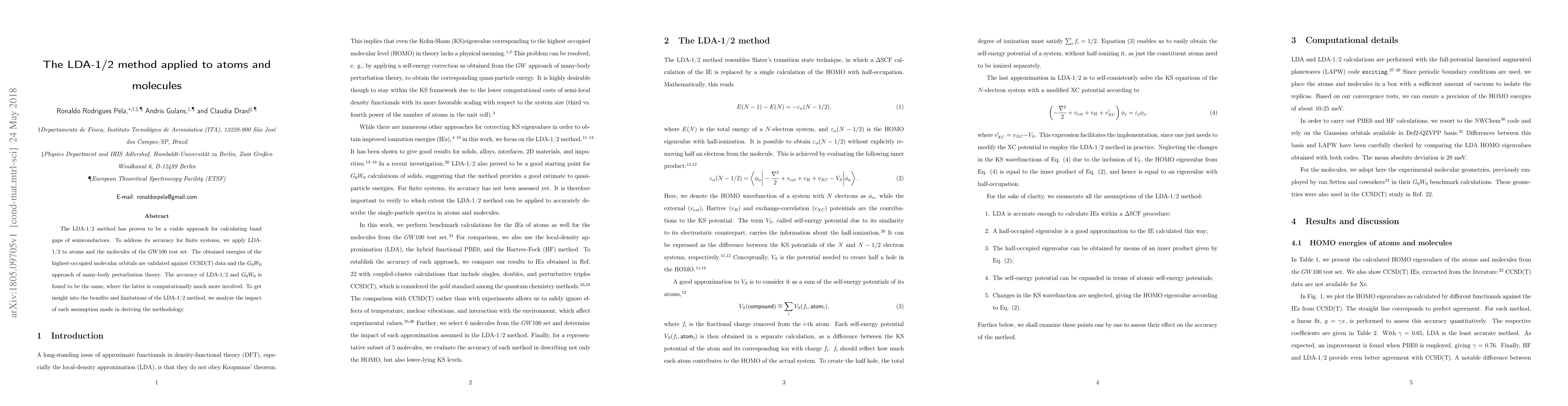 The LDA-1/2 method was applied to atoms and molecules from the GW100 test set, comparing HOMO energies with CCSD(T) data and the G0W0 approach. The impact of each assumption in deriving LDA-1/2 methodology was analyzed.